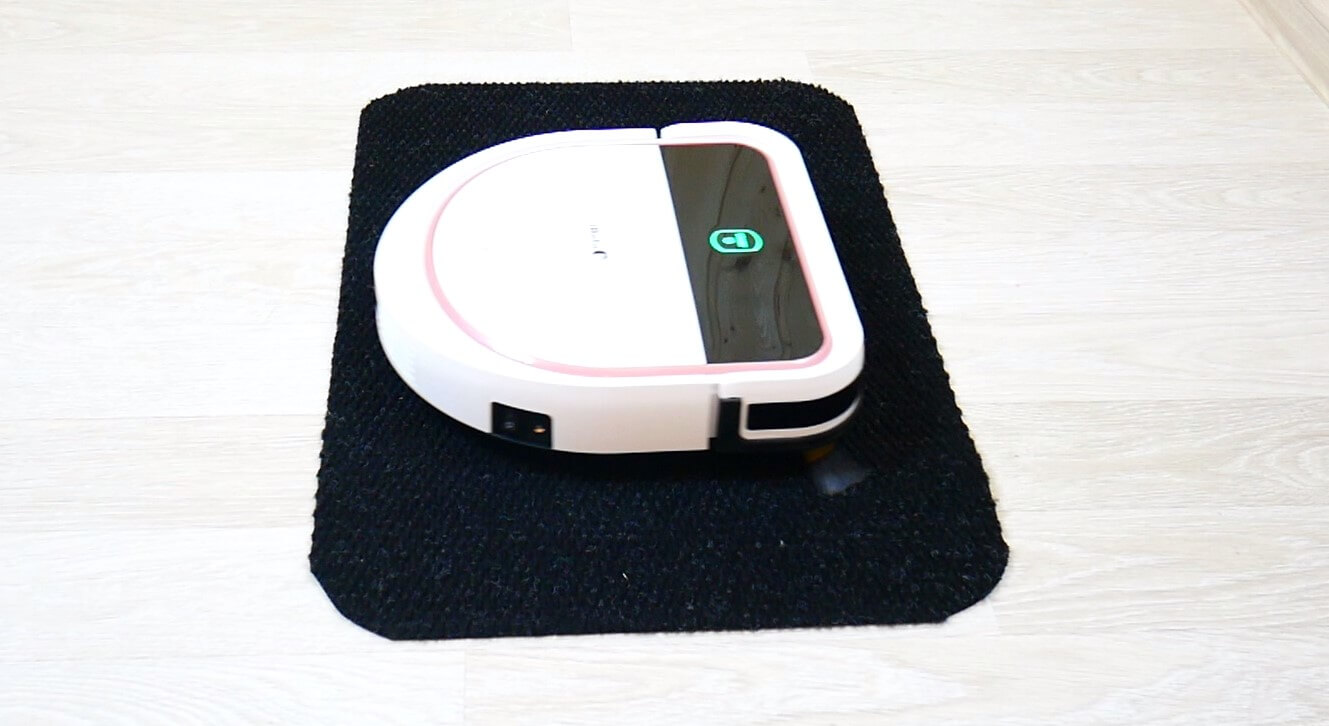 Robotas nebijo tamsių paviršių, o tai yra privalumas. Mūsų atveju jis be problemų užvažiavo ant juodo kilimo.