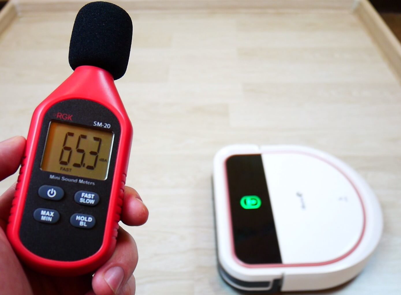 Galiausiai išmatavome „iBoto Smart N520GT Aqua“ triukšmo lygį skirtingais režimais. Esant minimaliai galiai, triukšmo lygis siekia 64 dB, o vidutiniu režimu – apie 65,5 dB. Esant maksimaliai galiai, triukšmo lygis siekia 66,7 dB. Tai yra robotinių dulkių siurblių standartas.