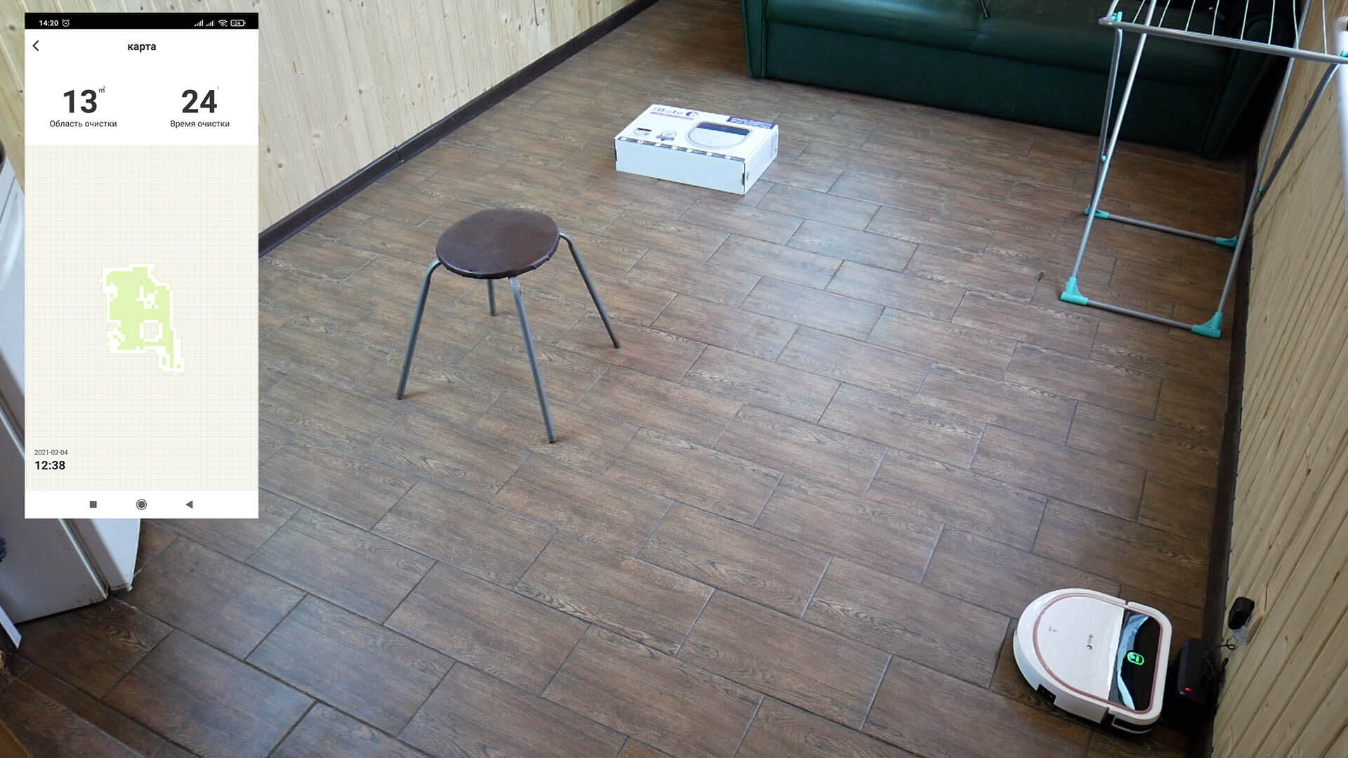Ir šiuo atveju problemų nekilo. Robotas sugebėjo aprėpti visą prieinamą plotą ir grįžti į bazę įsikrauti. Jis valė 65 minutes, pirmiausia zigzago būdu, o paskui aplink kambario perimetrą. Taigi, dėl navigacijos standartinėmis sąlygomis nusiskundimų nėra.