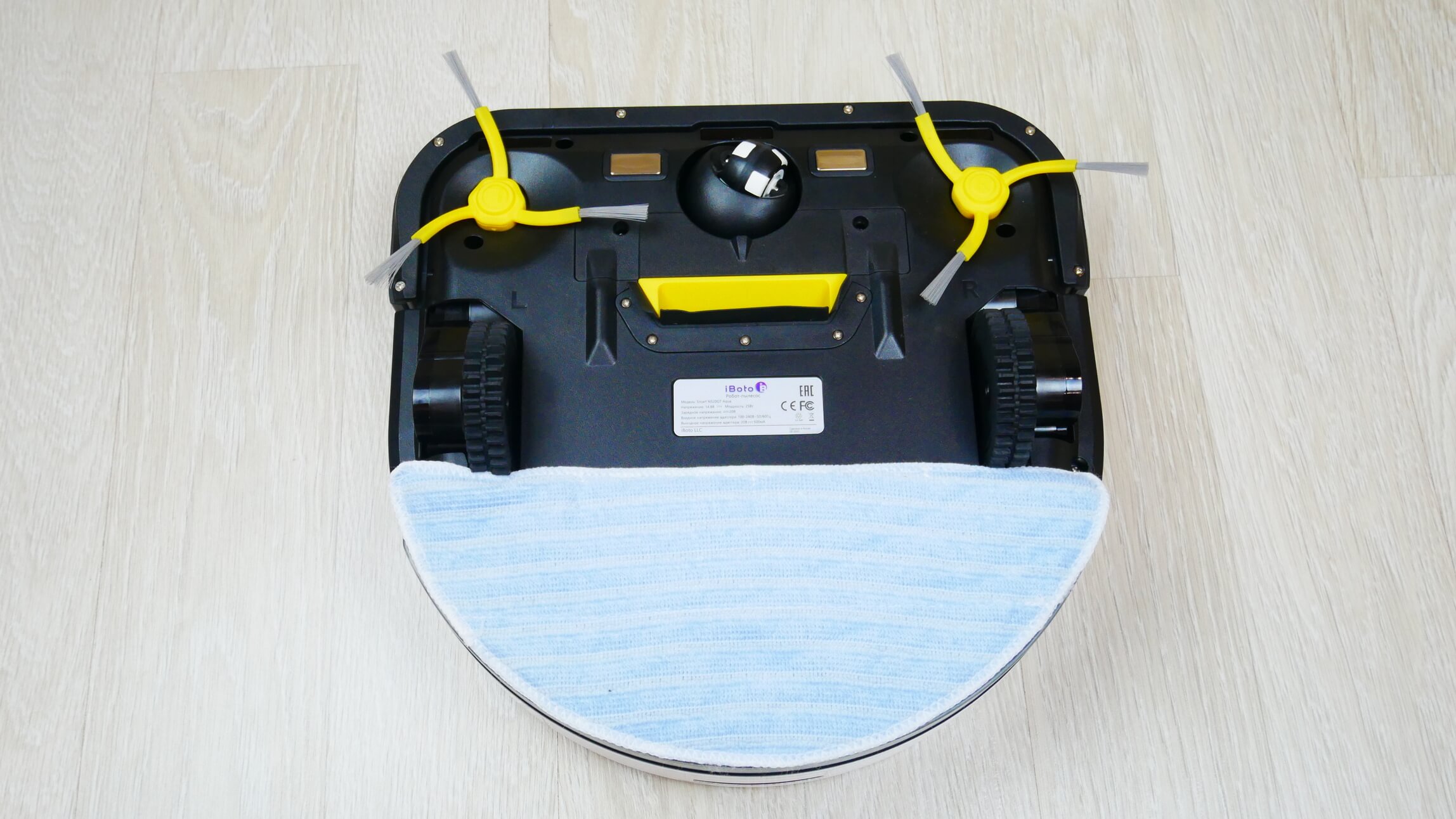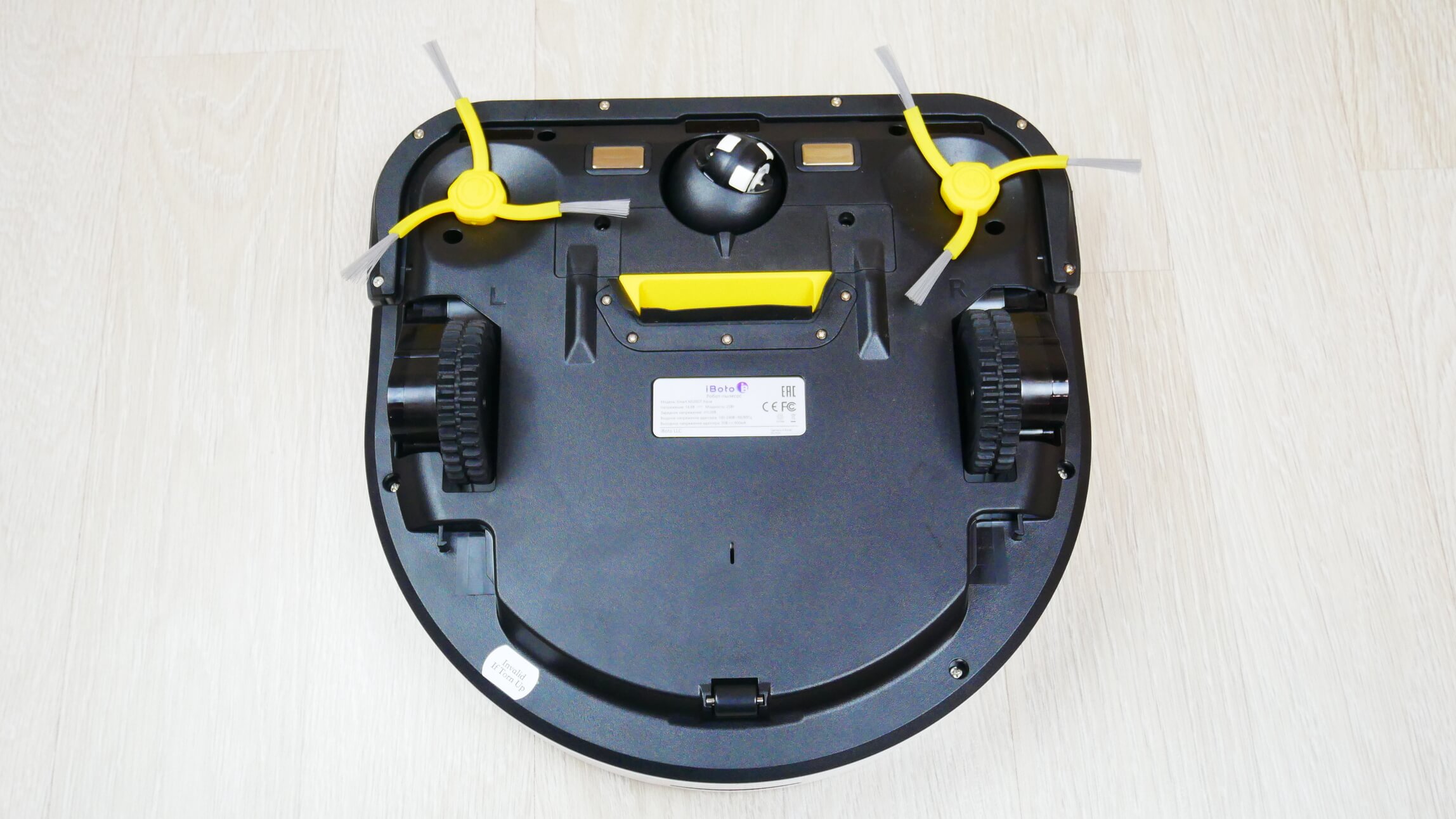 Pažvelkime į „iBoto Smart N520GT Aqua“ apačią. Matome du šoninius šepečius ir centrinę siurbimo angą. Šis modelis neturi centrinio šepečio.