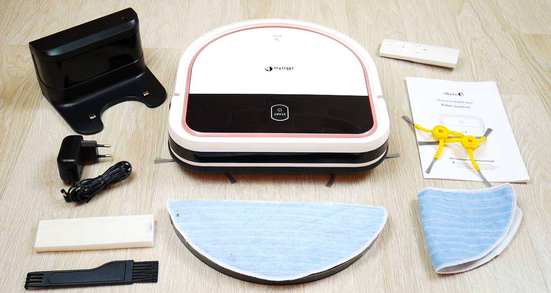 Pirmiausia apžvelkime „iBoto Smart N520GT Aqua“ komplektą. Robotas tiekiamas su įkrovimo baze, maitinimo adapteriu, drėgno valymo antgaliu su pritvirtinta mikropluošto šluoste, rusų kalba parašyta naudojimo instrukcija, nuotolinio valdymo pultu, atsargine šluoste, atsarginiu HEPA filtru, dulkių surinktuvo valymo šepetėliu ir dviem atsarginiais šoniniais šepetėliais.