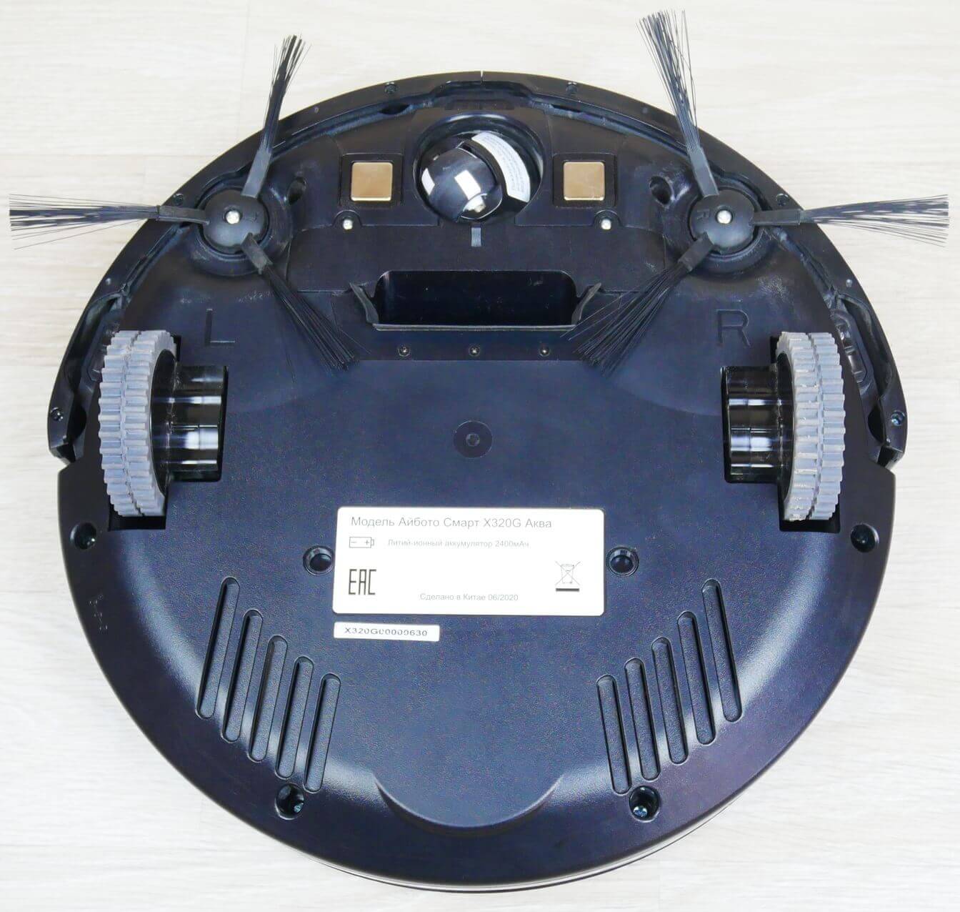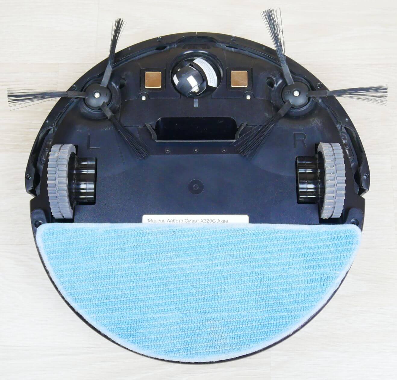 Apverskime robotinį dulkių siurblį ir apžiūrėkime jo apačią. Matome tris apsaugos nuo kritimo jutiklius priekyje, du šoninius šepečius ir centre siurbimo angą. Svarbu atkreipti dėmesį, kad „iBoto Smart Aqua X320G“ neturi turbošepečio. Šlapio valymo antgalis pritvirtintas įrenginio apačioje.