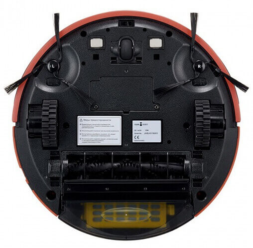 Taip pat roboto dulkių siurblio apačioje po dangteliu yra akumuliatorius, o šalia dulkių konteinerio yra skylės valymo įrenginiui pritvirtinti (šluostykite mikropluošto šluoste).