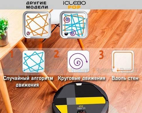 „iClebo Pop“ robotas dulkių siurblys veikia trimis režimais. Šie režimai apima vietinį režimą, kuris intensyviai valo tam tikrą plotą spiraliniu judesiu. Taip pat yra automatinis režimas su laiko apribojimu, kai dulkių siurblys juda atsitiktine tvarka. Galiausiai yra maksimalus režimas, leidžiantis „iClebo“ valyti visą pasiekiamą plotą, kol visiškai išsikrauna akumuliatorius.