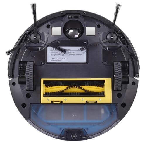 Apvertus robotinį dulkių siurblį, išryškėja du galingi varomieji ratai, priekinis volelis robotui apsisukti, pora šoninių šepečių, centrinis turbošepetys ir apsaugos nuo kritimo jutikliai. Taip pat matomas dulkių surinkimo skyrius su trijų pakopų filtravimo sistema (smulkus tinklelis grubiam valymui, putplasčio sluoksnis apsaugai nuo dulkių ir drėgmės bei smulkūs filtrai).