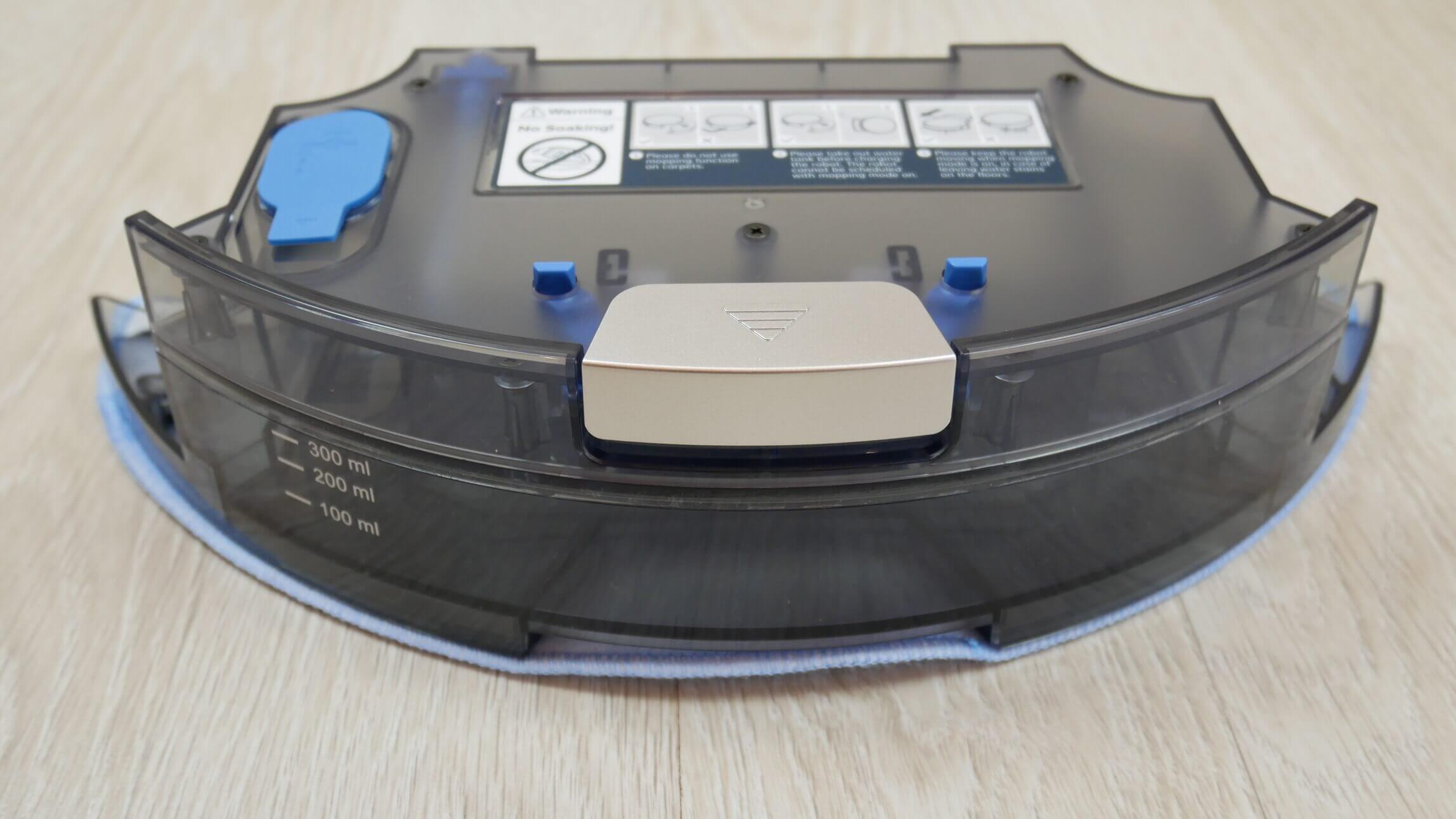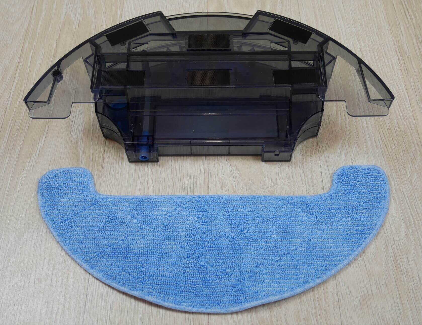 Vietoj dulkių surinktuvo galima įrengti vandens baką. Jame telpa 300 ml vandens. Taip pat yra nedidelis skyrius, skirtas sausoms šiukšlėms sušluoti šepečiais šlapio valymo metu. Viduje nematau pompos, bet yra vamzdelis, kuris jungiamas prie pagrindinio roboto bloko. Pompa greičiausiai įmontuota pačiame robote, nes programėlėje yra elektroninis vandens srauto valdymas. Valymo šluostė prie pagrindo pritvirtinta lipdukais ir elastinėmis juostelėmis.
