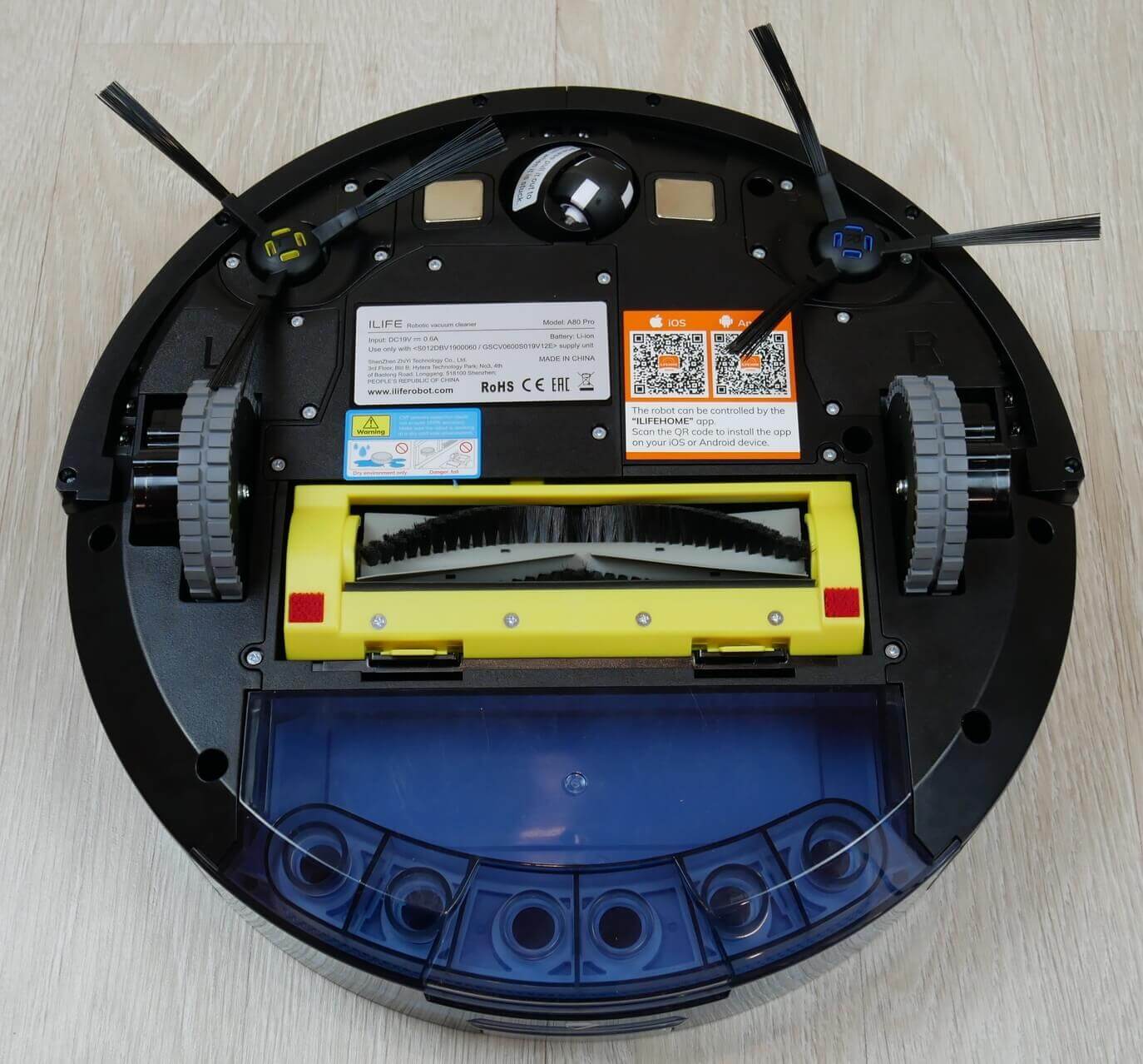 Apverskime robotą ir apžiūrėkime jo apačią. Jis turi du šoninius šepečius ir centrinį šepetį su šereliais ir žiedlapiais. Centrinis šepetys vienoje pusėje turi nuimamą dangtelį, skirtą pašalinti susivėlusius plaukus ir kailį. Roboto priekyje yra trys apsaugos nuo kritimo jutikliai.