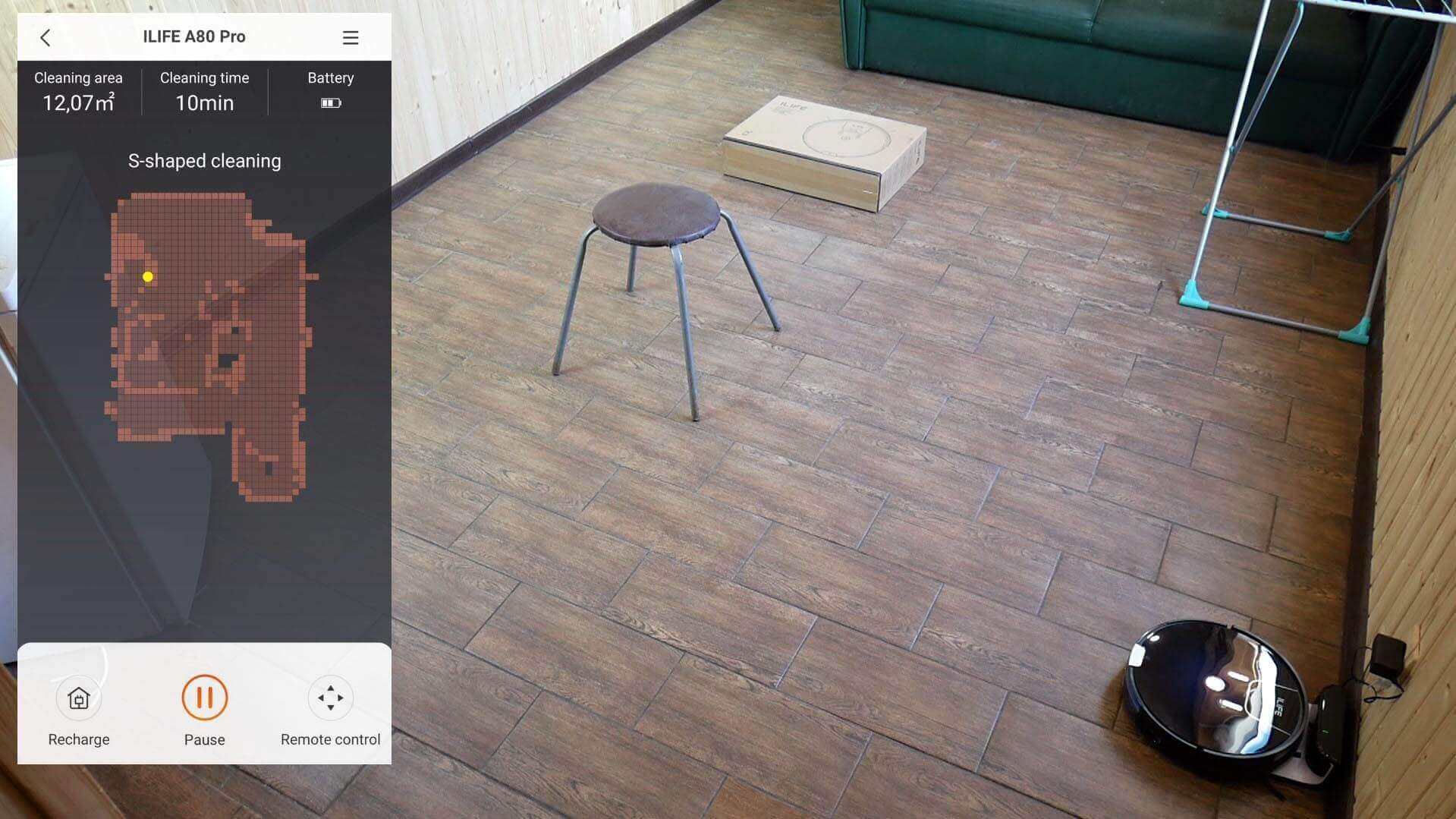 Pirmiausia patikrinkime „iLIFE A80 PRO“ navigaciją kambaryje su kliūtimis. Robotas perėjo visą prieinamą plotą vingiuotu raštu. Jis neužkliūno už kėdės kojų ar dėžės. Jis neužkliūno ant drabužių džiovyklės, bet ir neužsibūrė aplink perimetrą įveikęs visą prieinamą plotą. Apskritai navigacija yra standartinė robotams su giroskopu. Įrenginys išlaikė testą.