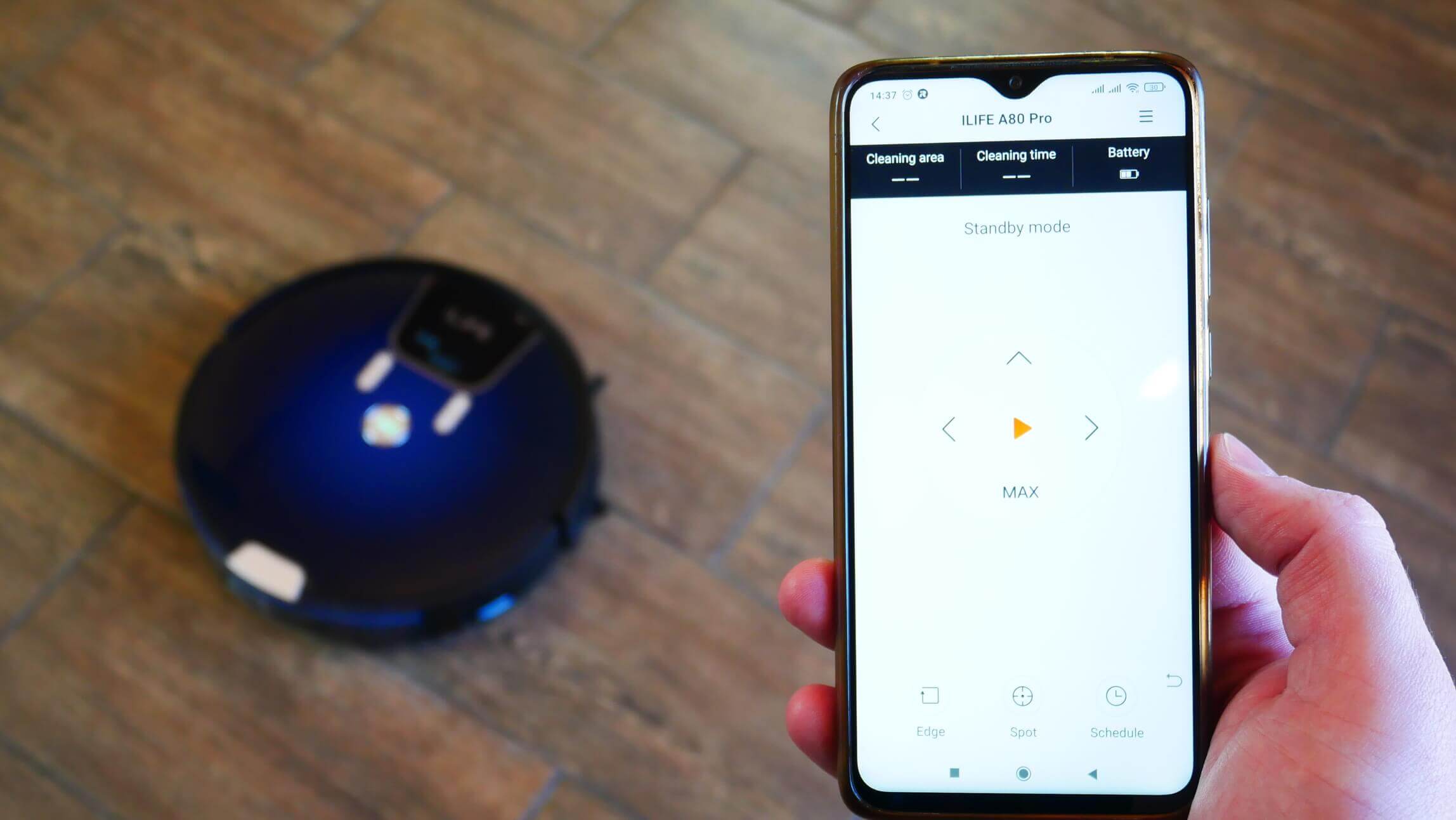 Pagrindiniame valdymo skydelyje galite grąžinti robotą į įkrovimo stotelę, įjungti automatinio valymo režimą ir įjungti rankinį roboto dulkių siurblio valdymą. Naudodami rankinį valdymą, galite rankiniu būdu nukreipti „iLIFE A80 PRO“ į norimą valymo vietą, nustatyti maksimalią siurbimo galią, įjungti perimetro valymą, taškinį valymą arba suplanuoti valymą. Tai visos roboto galimybės.
