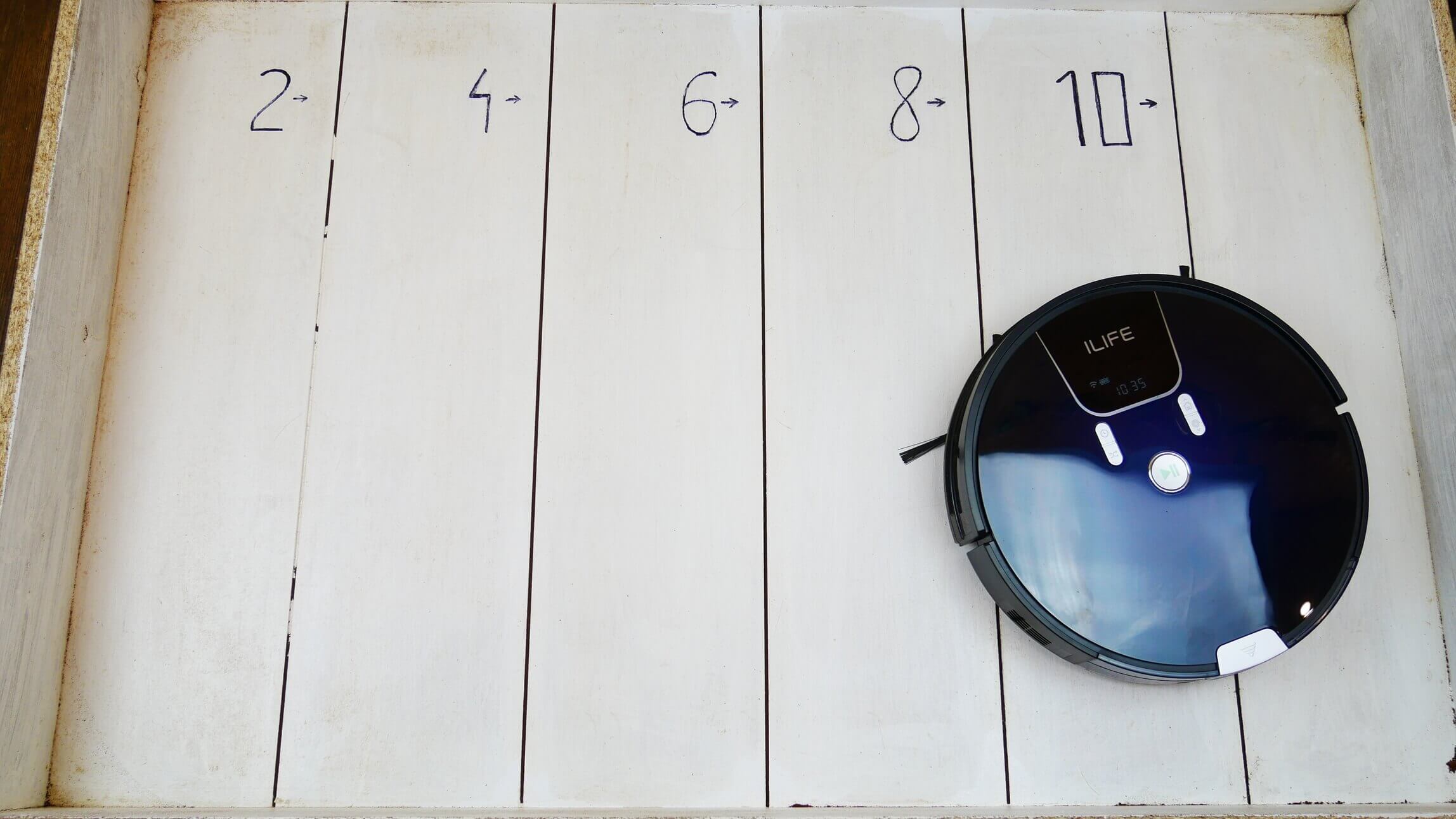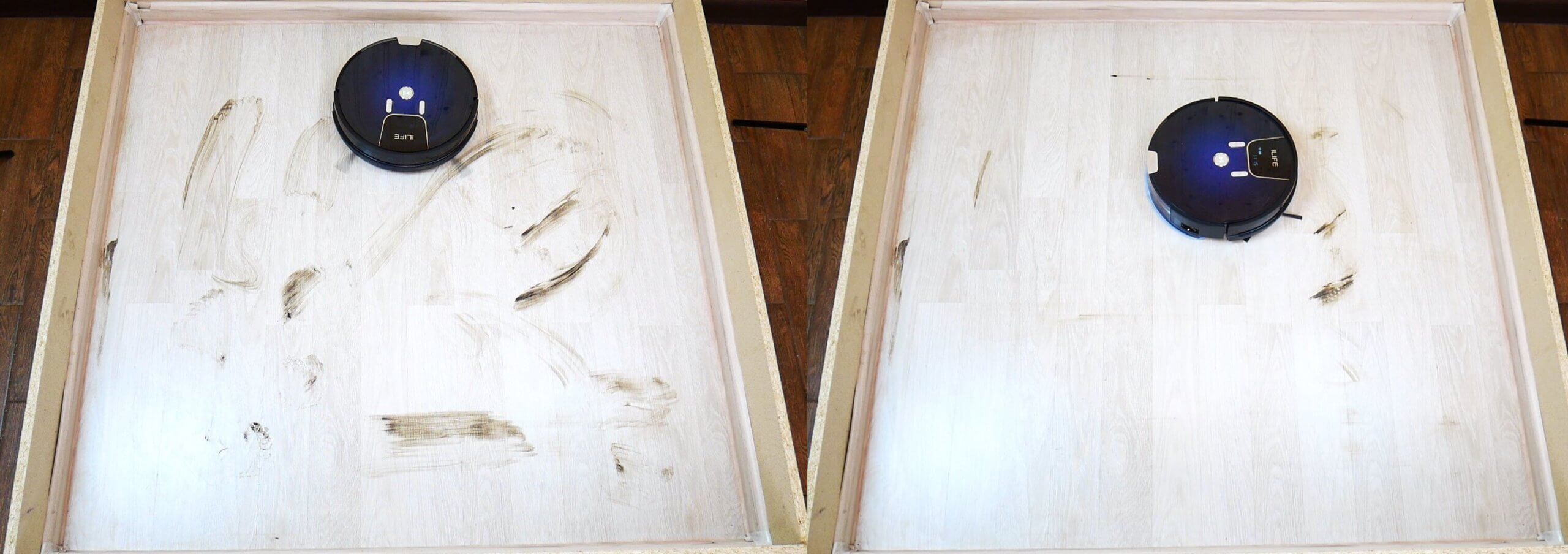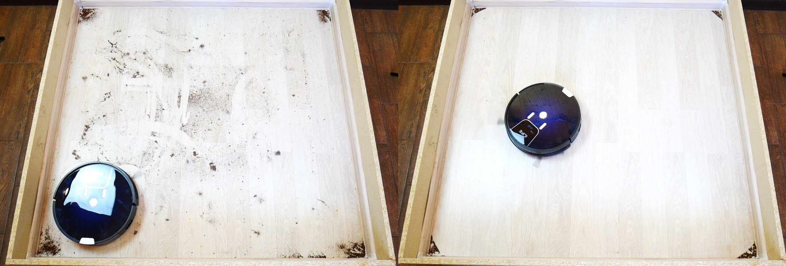 Kitas bandymas parodys, ar robotas gali pašalinti nešvarumus nuo grindų. Grindys šiek tiek sausos, ir matosi, kad robotas dulkių siurblys nelabai gerai šalina nešvarumus. Dalį jų jis pašalino, bet stovas nėra visiškai švarus.