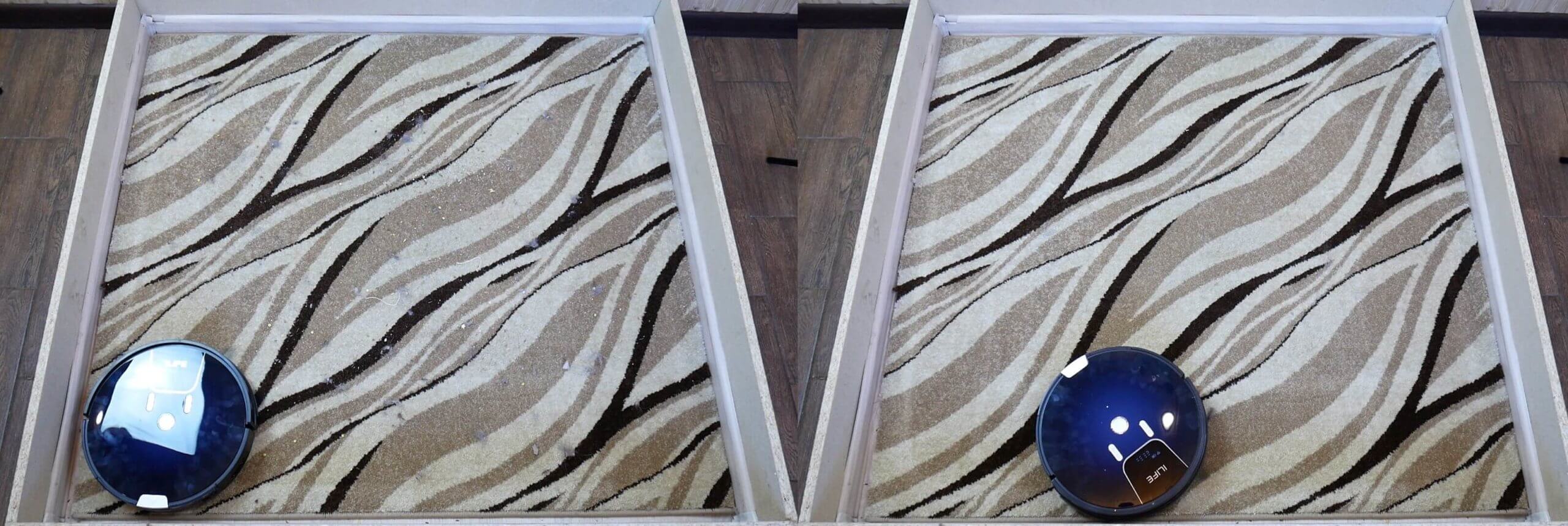 Tos pačios šiukšlės buvo išbarstytos ant kilimo. „iLIFE A80 PRO“ jį gana gerai išvalė, nepalikdamas jokių plaukų, naminių gyvūnėlių plaukų ar smulkių šiukšlių. Šis robotas rekomenduojamas kilimams valyti.