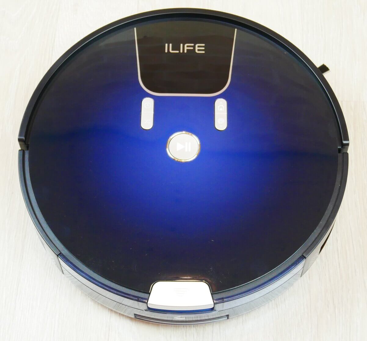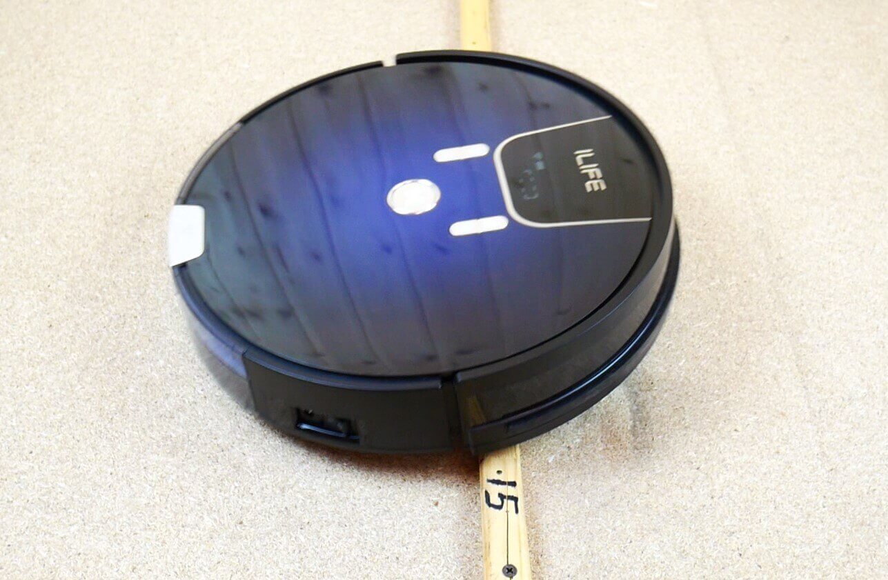 Dabar pažvelkime į „iLIFE A80 PRO“ dizainą. Jis apvalus, juodos ir mėlynos spalvos, o jo aukštis nuo grindų siekia 8 cm.