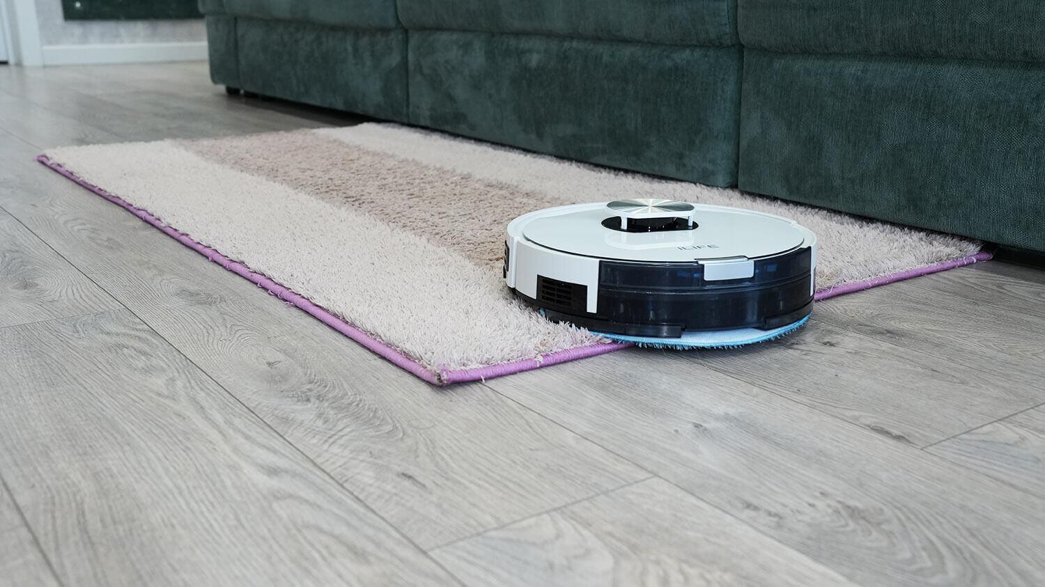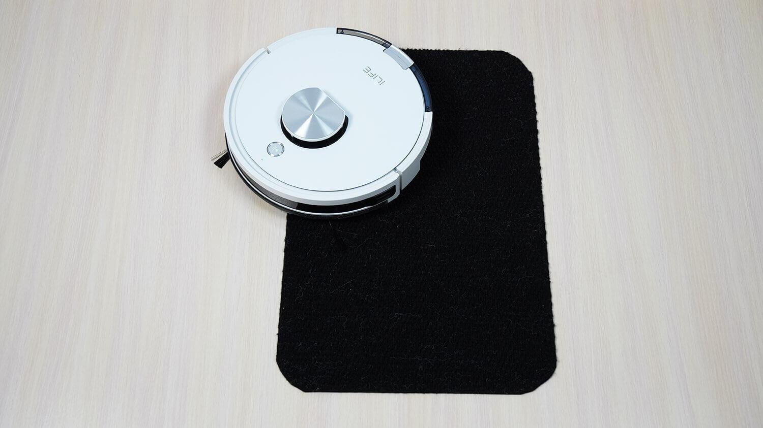 Ir puiku tai, kad šis robotas dulkių siurblys nebijo juodų kilimų ir lengvai jais juda. Tai yra pliusas.