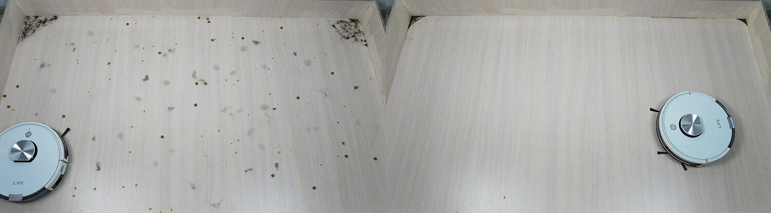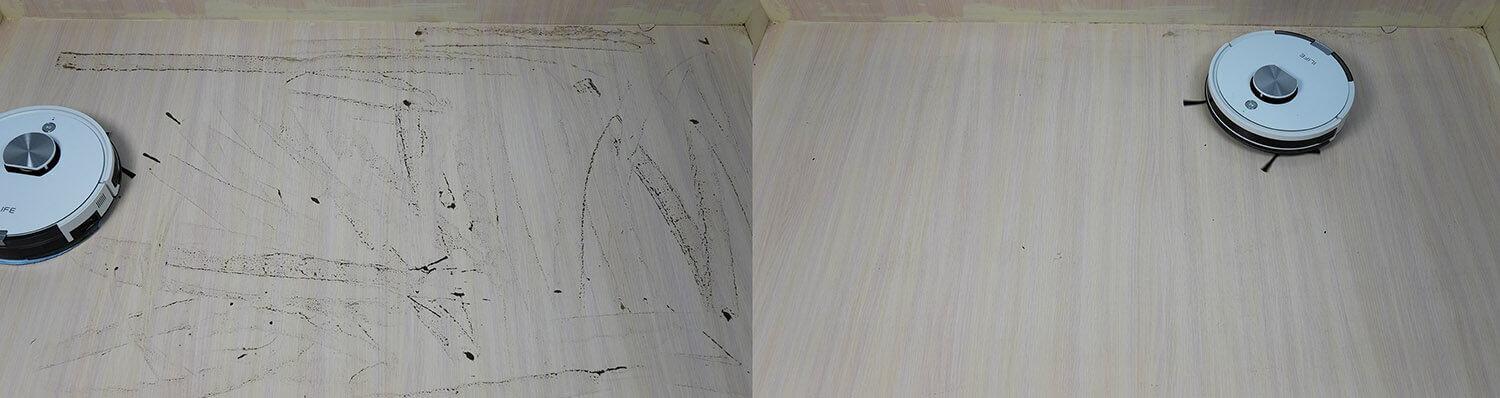 Laminuotų grindų sauso valymo efektyvumas yra geras. Robotas dulkių siurblys sugebėjo surinkti nuo grindų daugumą šiukšlių, įskaitant ne tik smulkias buitines šiukšles, bet ir naminių gyvūnėlių plaukus bei plaukus. Kampuose liko tik nedidelis kiekis šiukšlių, kurių beveik visi rinkoje esantys apvalūs robotai nesugeba efektyviai išvalyti. Centrinis ir šoniniai šepečiai surinko šiek tiek naminių gyvūnėlių plaukų ir plaukų. Tačiau panašiomis sąlygomis silikoninis šepetys po bandymo liko švarus.
