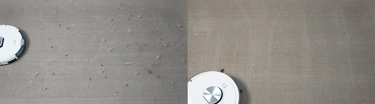 Pavyzdžiui, kilimą jis išvalė vos keturiais braukimais. Jei jis būtų buvęs nešvarus, šoniniai šepečiai nebūtų surinkę dalies šiukšlių; tam reikalingas glaudesnis kontaktas su turbo šepečiu. Kiti robotai tą patį kilimą išvalo iki septynių braukimų, ir, mano nuomone, šis algoritmas yra efektyvesnis. „Gyvatėlė“ yra griežtesnė. Apskritai pati navigacija yra gera, nebuvo neišvalytų vietų, tačiau valymo algoritmas nėra pats efektyviausias.