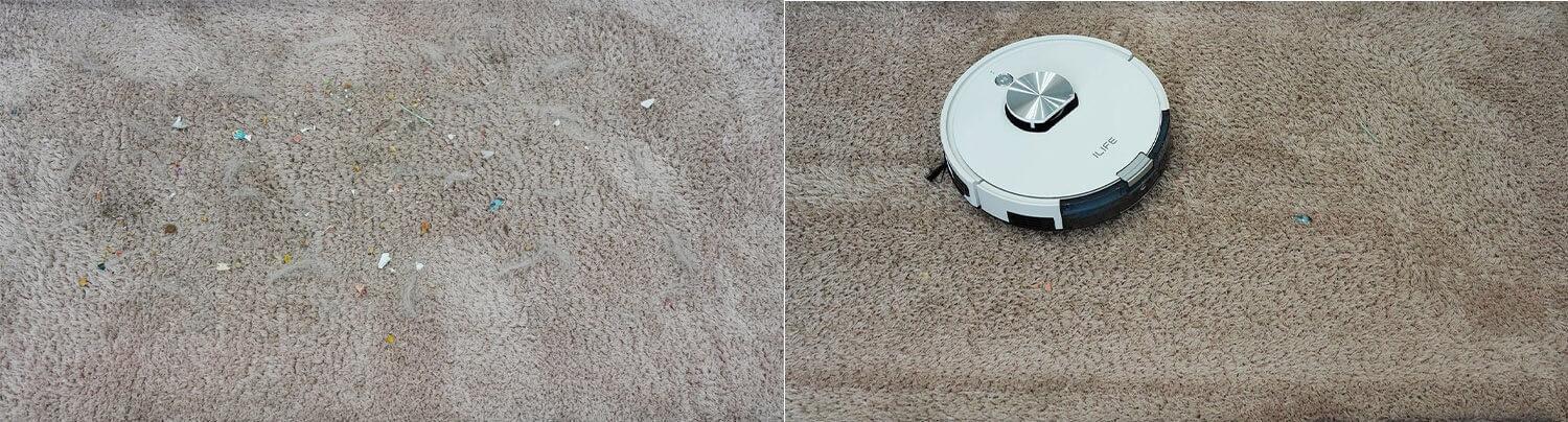 Šerelių formos šepetys yra aiškus nugalėtojas valant kilimus. Jis geriau surenka šiukšles nuo kilimų ir apmušalų. Silikoninis šepetys nėra toks efektyvus valant kilimus, todėl turėkite tai omenyje. Apskritai „iLIFE L100“ kilimų valymo našumas yra vidutinis.