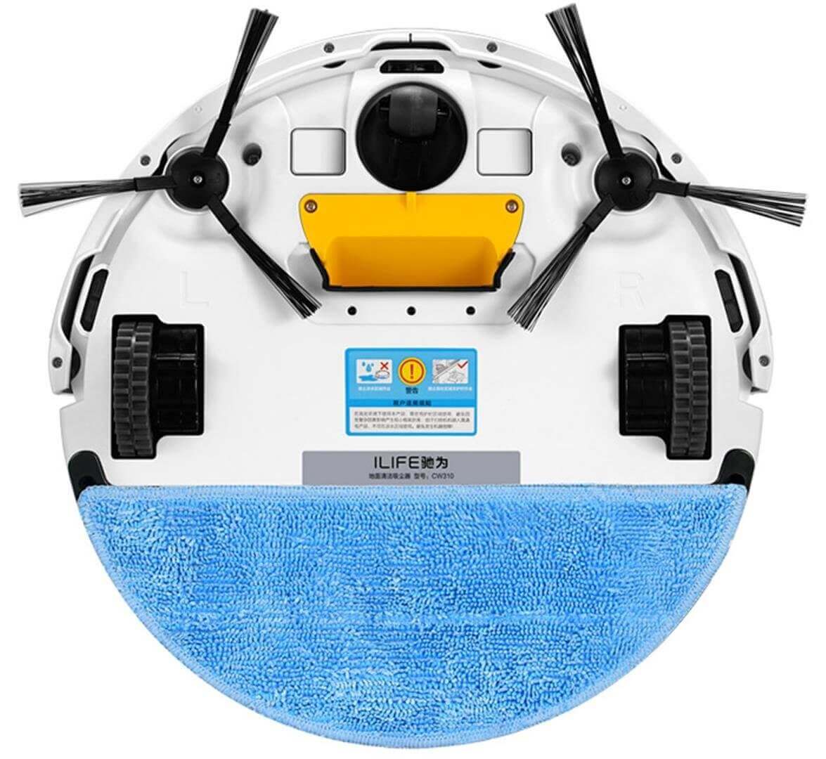 Apžvelgdami „iLife V5s Pro“ iš apačios, matome du šoninius ratukus, priekinį pasukamą volelį, šoninius šepetėlius, nedidelę skylutę šiukšlėms išsiurbti, porą kontaktinių pagalvėlių įrenginiui pritvirtinti prie įkrovimo stotelės ir įkrauti, dvi skylutes vandeniui tiekti į valymo šluostę ir vietą valymo šluostės laikikliui, kuris tvirtinamas „Velcro“ juosta, įrengti.