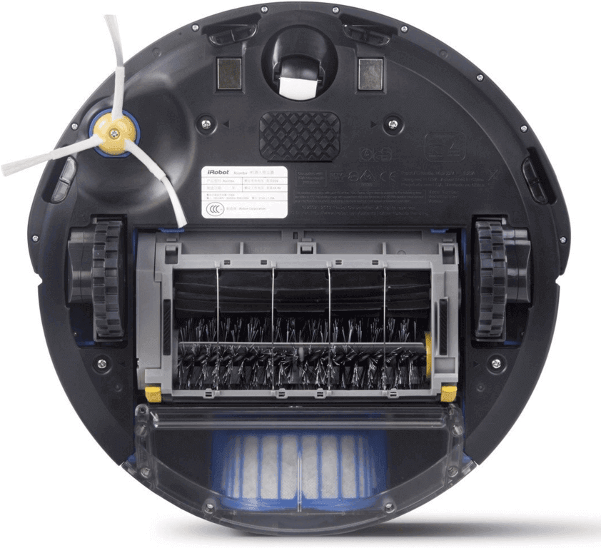 Apvertus robotą dulkių siurblį, matyti varančiosios pusės ratukai, priekinis pasukamas volelis, kontaktiniai kilimėliai, skirti prijungti prie įkrovimo stotelės, akumuliatoriaus dangtelis, matoma dulkių surinktuvo dalis, vienas šoninis šepetys ir pora priešpriešinėmis kryptimis besisukančių turbošepečių.