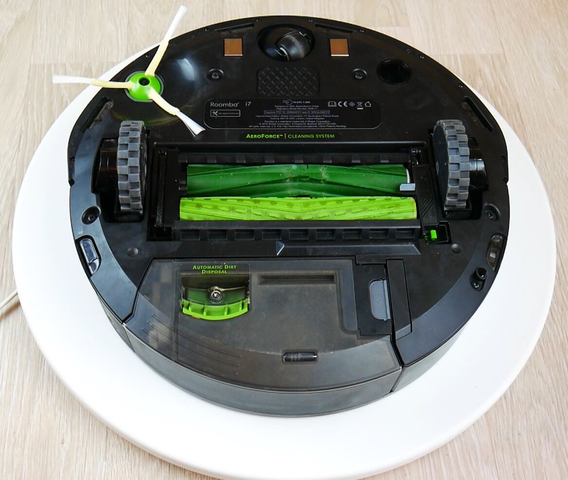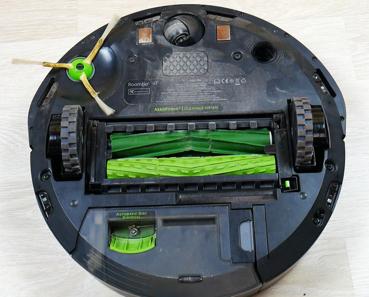 Dabar parodysiu, kaip „iRobot Roomba i7+“ atrodo iš apačios. Verta paminėti, kad jau metus nekeičiau nei šepečių, nei volelių. Štai jų tikroji būklė.