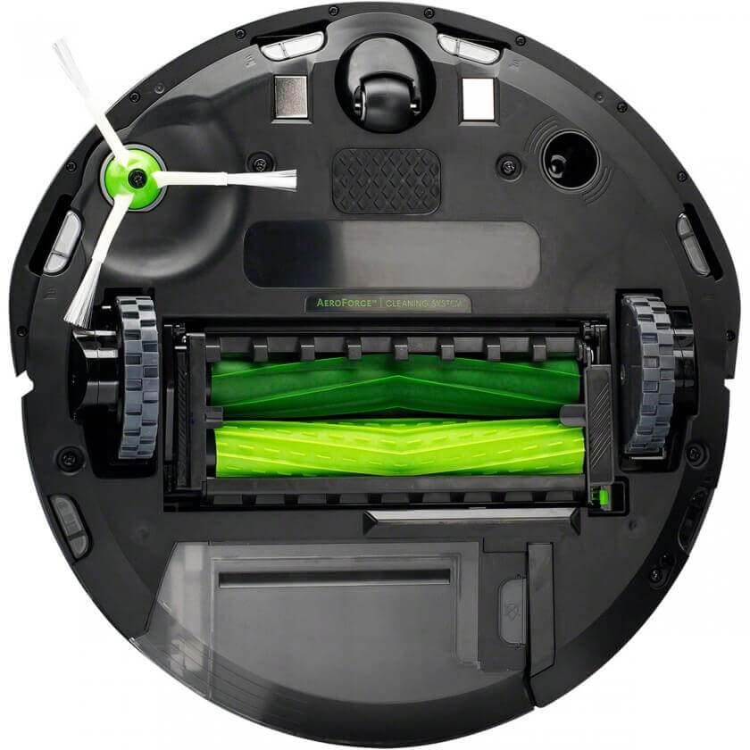 „iRobot Roomba i7+“ apačioje yra varomieji ratai, vienas priekinis ratas, akumuliatoriaus skyrius, kontaktai automatiniam įkrovimui įkrovimo stotelėje, šoninis šepetys ir guminių volelių grandiklių sistema.