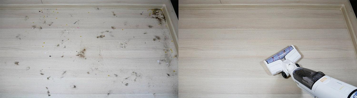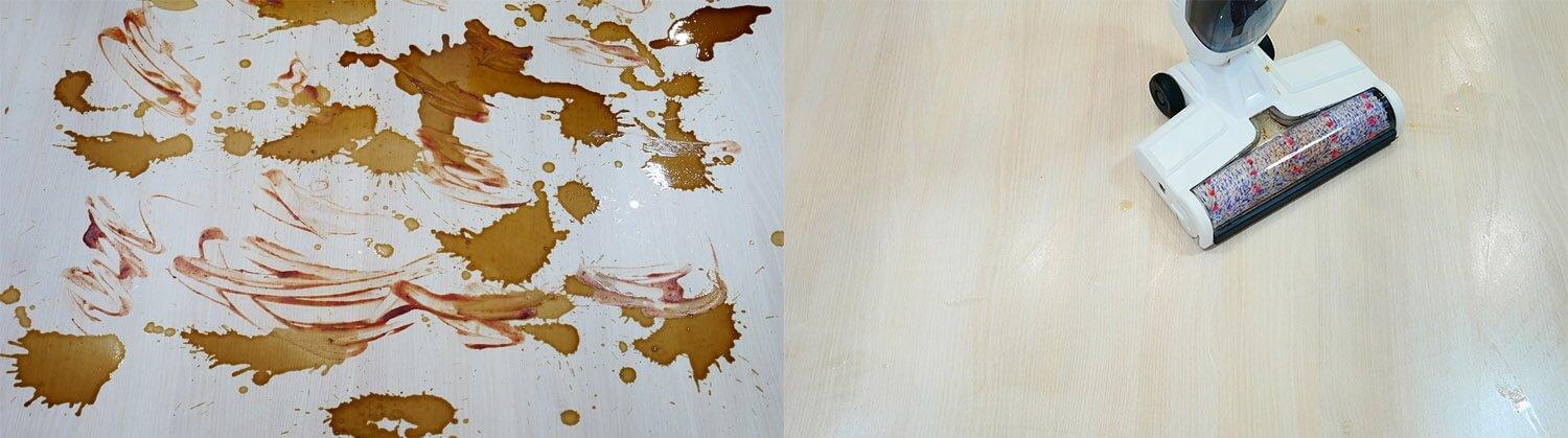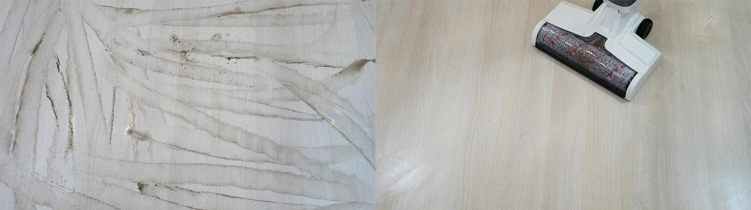 Taip pat buvo išbandytas cheminis valymas. „Joyami JW1“ gerai surenka įvairias šiukšles nuo laminuotų grindų. Nėra aklųjų zonų palei grindjuostes ar kampuose. Tai privalumas.