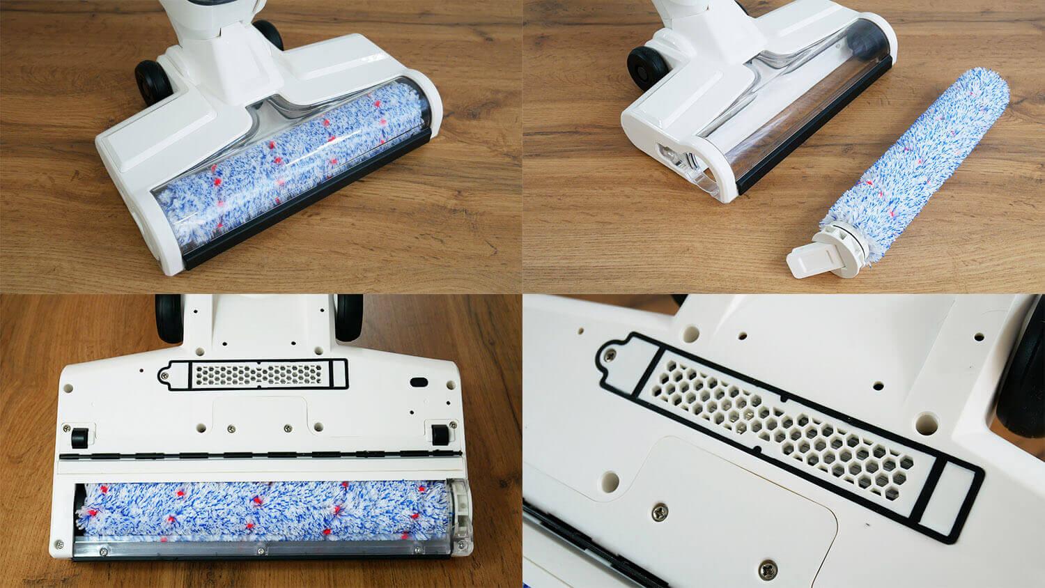 Dabar pažvelkime į „Joyami JW1“ dizainą. Pradėkime nuo valymo modulio. Volelis yra nuimamas iš šono. Jis pagamintas iš minkštų šerelių su elastingais šereliais viduje, kad sugautų plaukus ir kailį. Viršutinis dangtelis nėra nuimamas, o tai yra šiek tiek nepatogu.