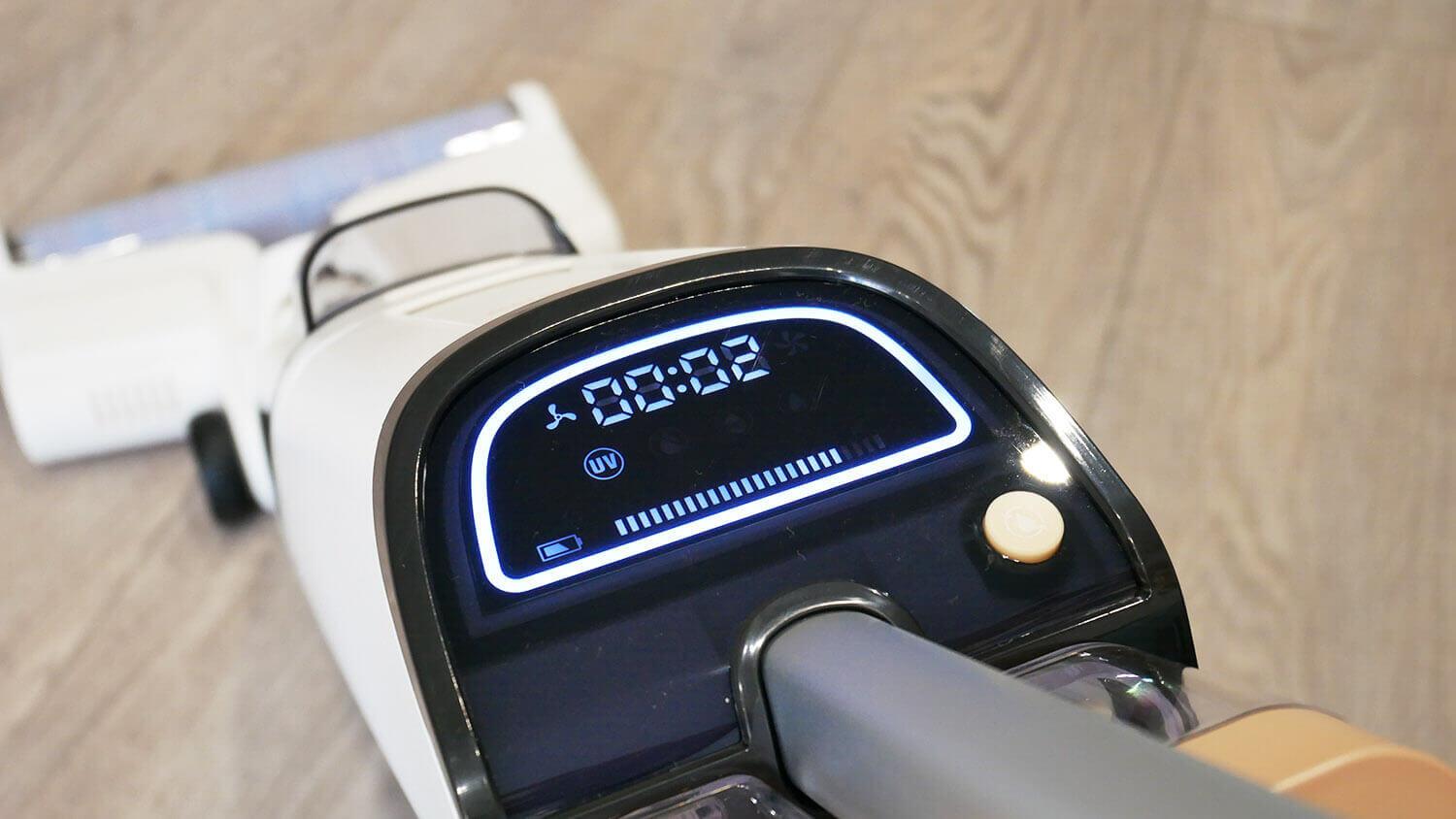 Korpuso viršuje yra informacinis ekranas, kuriame rodomas pasirinktas veikimo režimas, akumuliatoriaus įkrova ir techninės priežiūros pranešimai. Šalia jo yra mygtukas, skirtas paleisti savaiminio valymo funkciją.