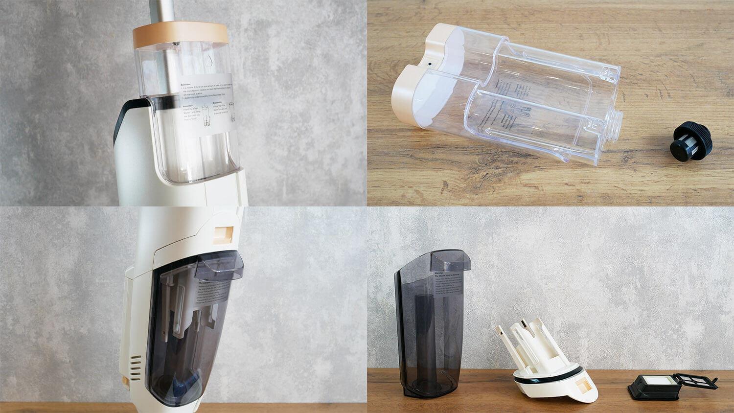 Virš valymo modulio yra 450 ml talpos nešvaraus vandens bakas. Jame yra HEPA filtras su tinkleliu ir elektroniniais vandens lygio jutikliais. Šiurkštus filtras nepridedamas; gamintojas vietoj jo pridėjo jau minėtą kiaurasamtį.
