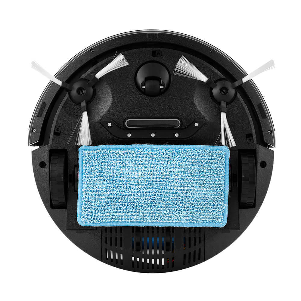 Žiūrint į robotą dulkių siurblį iš apačios, matyti du varomieji ratai, besisukantis volelis, šoniniai šepečiai, baterijų skyrius, paviršiaus jutikliai ir siurbimo anga. Čia taip pat sumontuotas šlapio valymo antgalis, prie kurio lipnia juosta pritvirtinta mikropluošto šluostė.