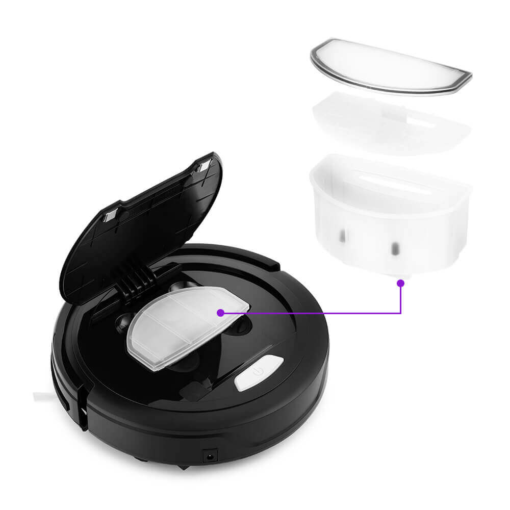 - Robotas dulkių siurblys su įmontuota dulkių surinkimo talpykla ir filtru.