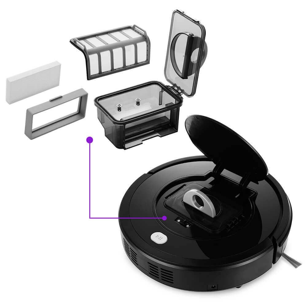 Sausam grindų valymui robotas naudoja du šoninius šepečius, kurie sušluoja šiukšles ir nukreipia jas link padidinto siurbimo angos. Latakas surenka šiukšles ir dulkes į dulkių surinktuvą – 300 mililitrų talpos talpyklą su dviguba filtravimo sistema (šiurkštus filtras ir smulkus filtras).