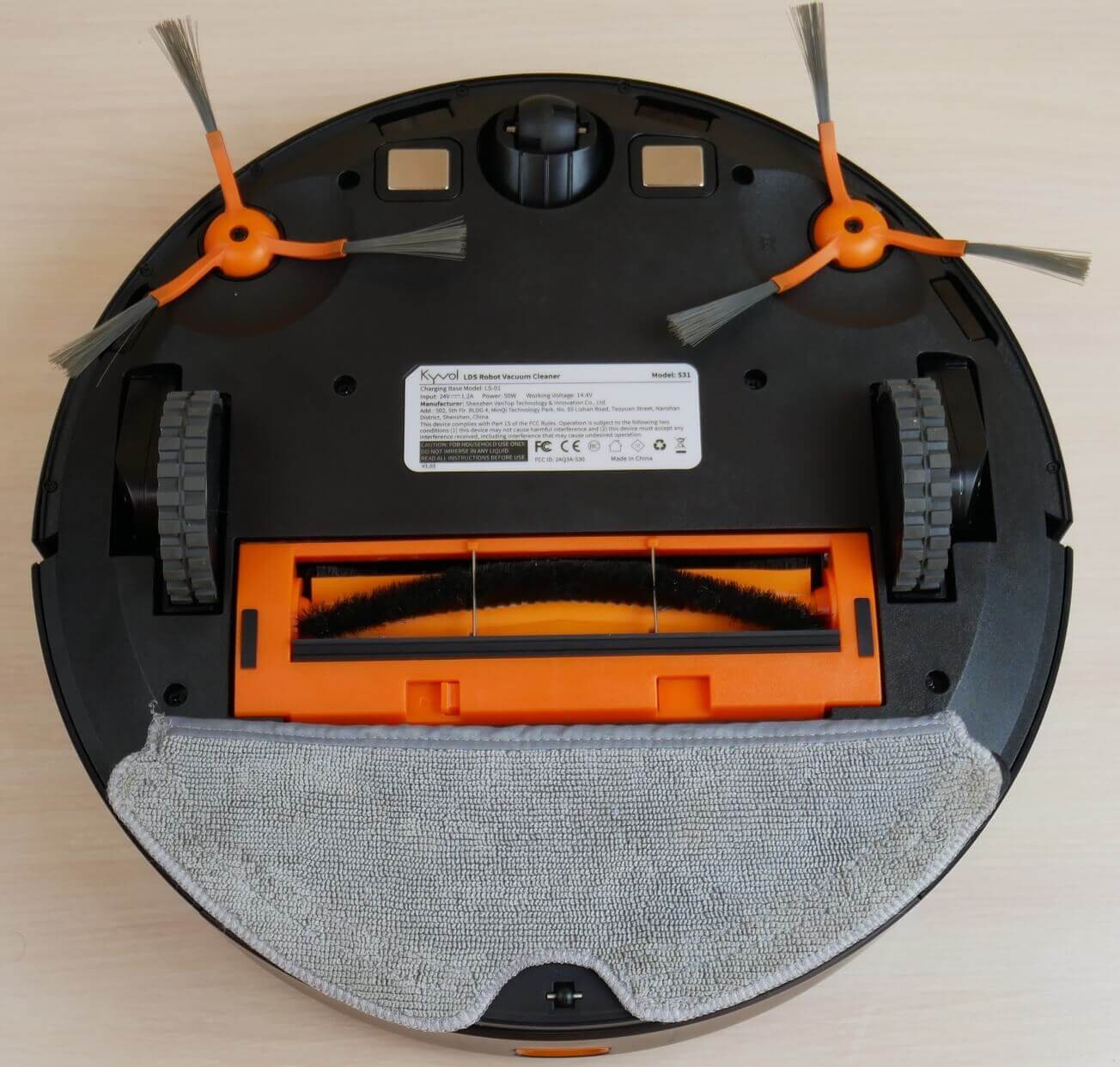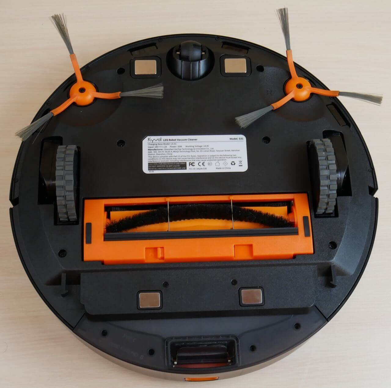 Pažvelkime į „Kyvol Cybovac S31“ apačią. Jame yra keturi apsaugos nuo kritimo jutikliai. Priekyje matomi du šoniniai šepečiai, o tai yra privalumas. Atkreipkite dėmesį, kad roboto apačioje yra dvi gnybtų poros: viena priekyje ir viena gale.