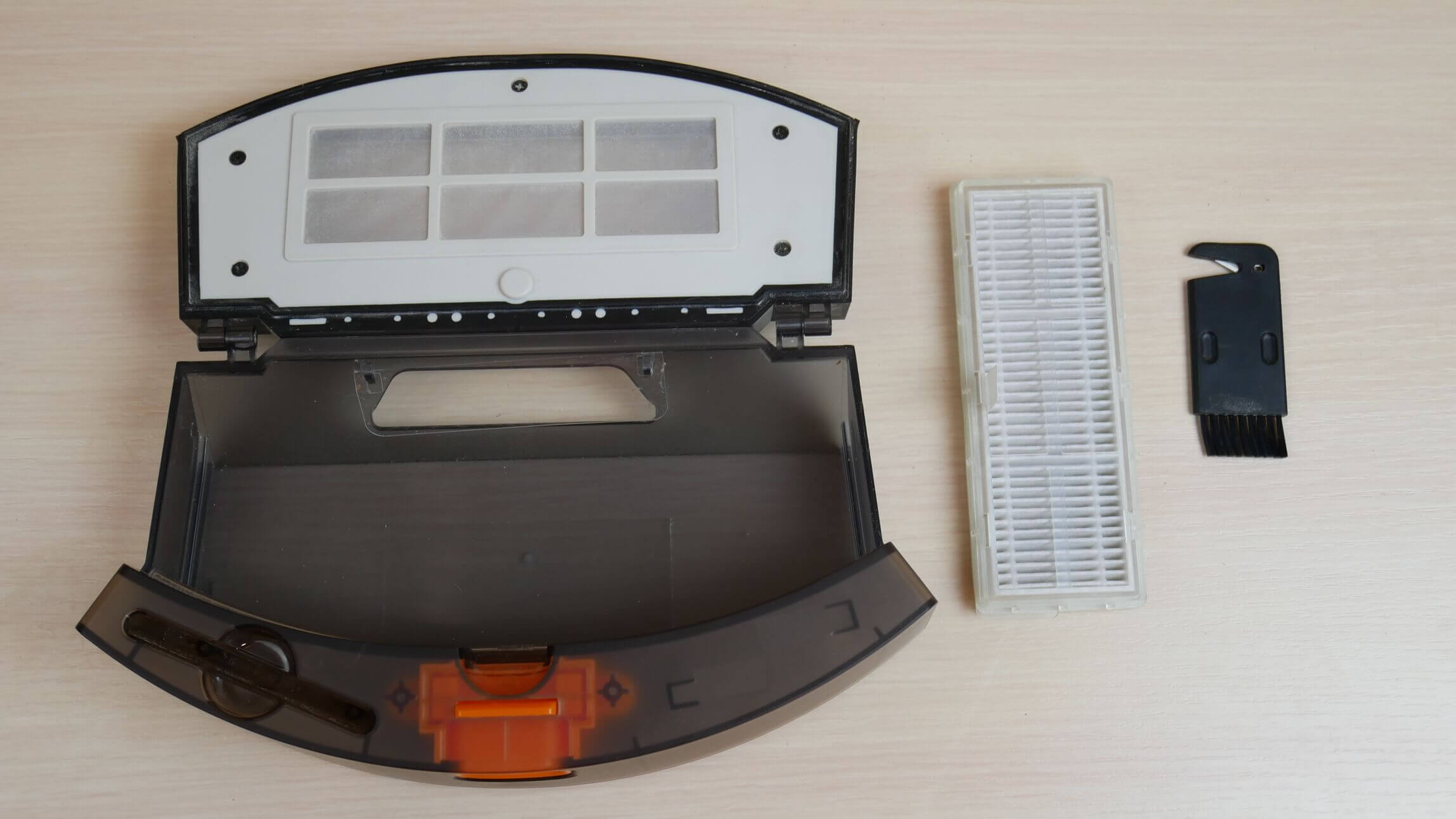 Dulkių talpyklą galima nuimti iš galo. Apačioje esantis atvartas leidžia ištuštinti talpyklą į maišelį pagrinde. Talpykloje patogiai laikomas roboto valymo šepetėlis.