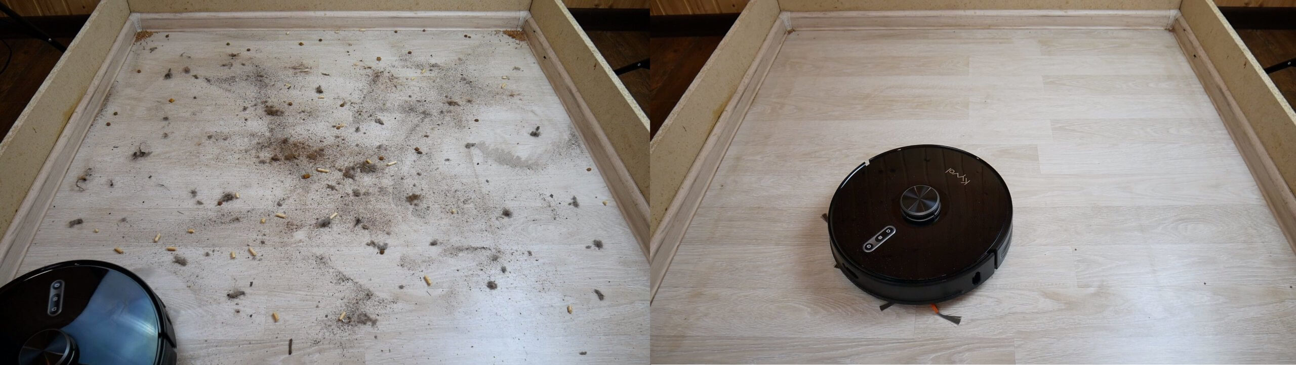 Kalbant apie siurbimo galią, nepaisant to, kad deklaruojama 3000 Pa, robotas net negali visiškai išvalyti šiukšlių iš 2 mm gylio įtrūkimo; jis tik šiek tiek iššlavė vienoje vietoje.