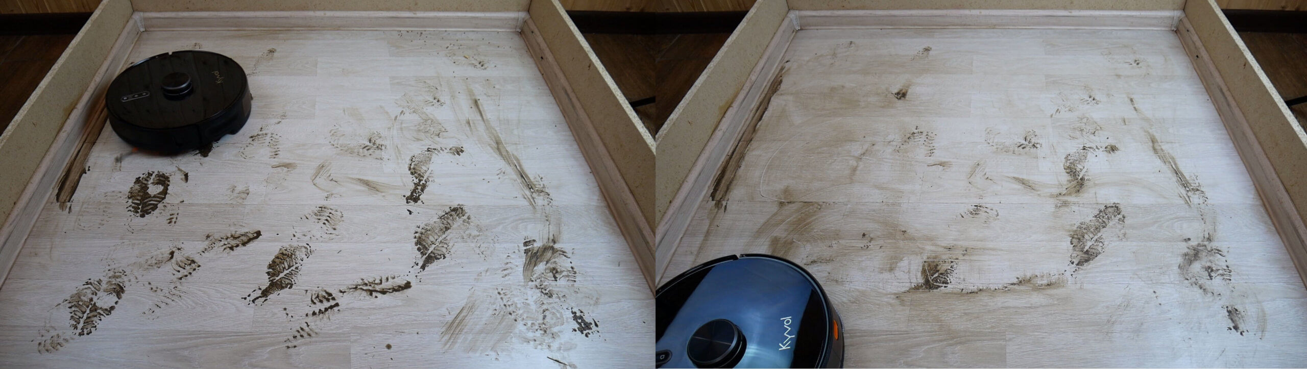 Kalbant apie šlapią valymą, jis įdiegtas gana grubiai. Pirma, nėra elektroninio vandens srauto reguliavimo, o vandens srautas ant šluostės nėra labai gausus. Antra, pati šluostė tvirtai neprispaudžia prie grindų, todėl robotas negali pašalinti net šiek tiek pridžiūvusių nešvarumų. Tai akivaizdi šio testo nesėkmė.
