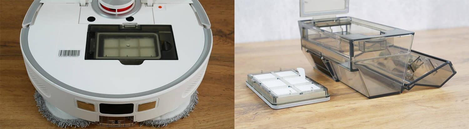 Dulkių surinktuvas yra po viršutiniu dangčiu. Jame telpa 350 ml sausų atliekų. Viduje yra užuolaida, pro kurią atliekos įsiurbiamos į maišelį stotelėje. Filtravimo sistema pagrįsta tik HEPA filtrais. Robotas neturi vandens bako. Servetėlės sudrėkinamos tik stotelėje.