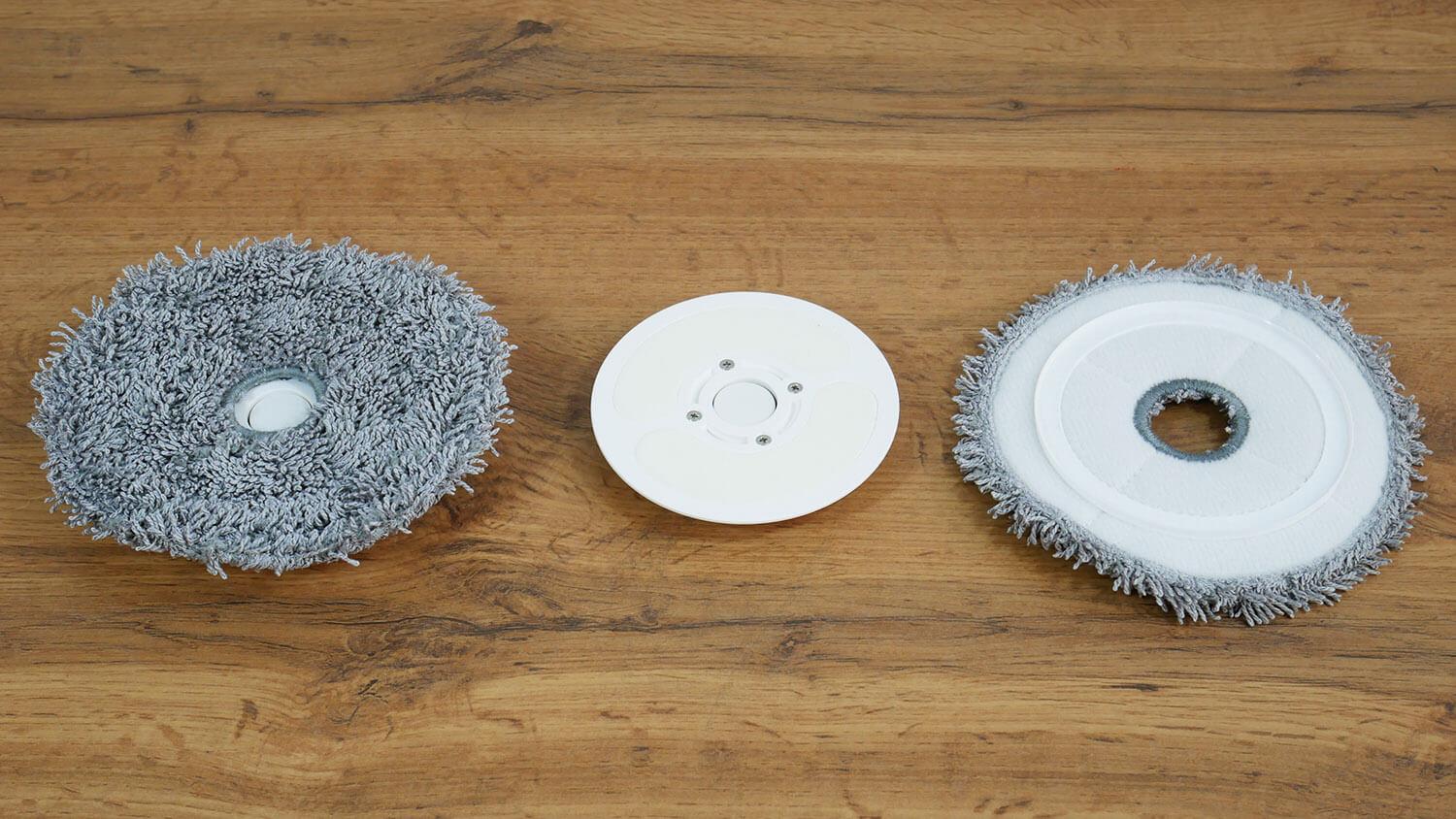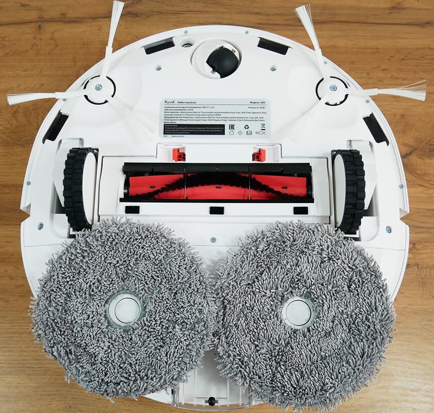 Kaip ir jo analogų, „Kyvol S60“ valymo pagalvėlės nesiekia korpuso kraštų, todėl spėju, kad robotas negalės išvalyti nešvarumų iki pat grindjuosčių ir baldų. Tai bus patvirtinta bandymų metu. Taip pat norėčiau atkreipti dėmesį, kad valymo pagalvėlės nepakyla važiuojant ant kilimų, todėl, jei norite, kad dulkių siurblys sausai valytų kilimus, turėsite jas nuimti rankiniu būdu.