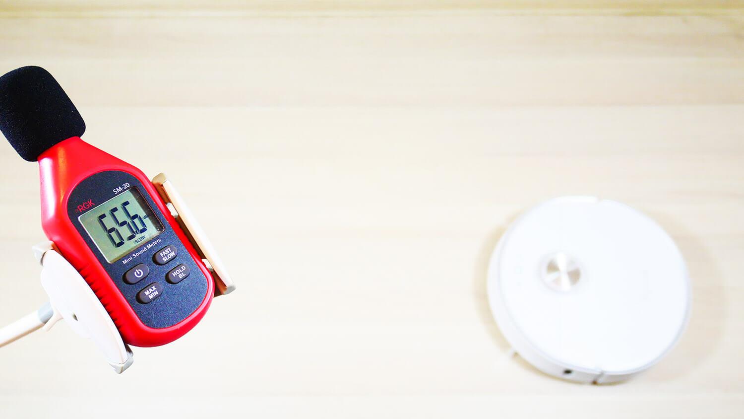 Galiausiai, išmatavome roboto triukšmo lygį skirtingais režimais. Jis svyravo nuo 58 iki 67,5 dB. Gana standartinis!
