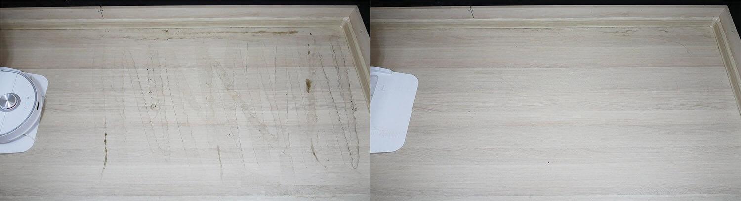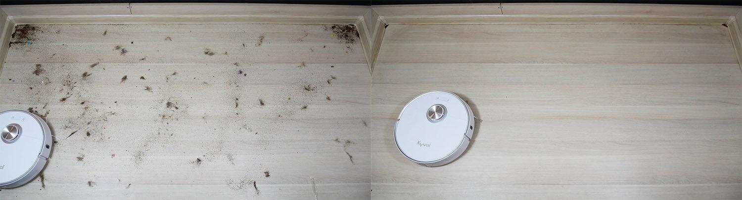 Šis robotas dulkių siurblys gerai pašalina nešvarumus, nepalikdamas dryžių ar žymių. Kaip ir tikėtasi, siauras grindų ruožas palei grindjuostę liko neplautas, nes servetėlės nepasiekė kraštų. Su „Kyvol S60“ neplautas plotas buvo apie 4 cm pločio.