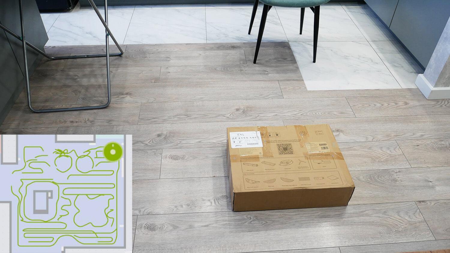 Galiausiai pereikime prie bandymų. Pirmiausia išbandysime „Kyvol S60“ navigaciją kambaryje su kliūtimis. Robotas dulkių siurblys pirmiausia juda aplink kambario perimetrą, o tada gyvatės būdu išvalo visą prieinamą plotą. Jis neužsikabino ant drabužių džiovyklės kojų, nors trumpai užtruko. Jis taip pat atskirai išvalė dėžę ir kėdžių kojas, o tada grįžo į stotelę. Bandymas buvo sėkmingas.