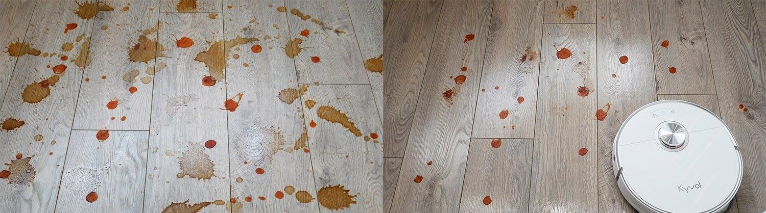 Robotui dulkių siurbliui sunkiai sekasi pašalinti pridžiūvusias kavos ir padažo dėmes. Jam pavyko pašalinti kavos dėmes, bet nepavyko pašalinti padažo. Gindamasis galiu pasakyti, kad jis nėra skirtas tokio tipo valymui. Bandymas tik parodė, kad valymo pagalvėlės nespaudžia grindų taip stipriai, kaip specializuoti grindų valymo robotai. Kasdien naudojant šį robotą dulkių siurblį vis tiek laikyčiau grindis grindims plauti skirtu skysčiu, ypač jei valymo intervalas nustatytas kas 6 minutes.