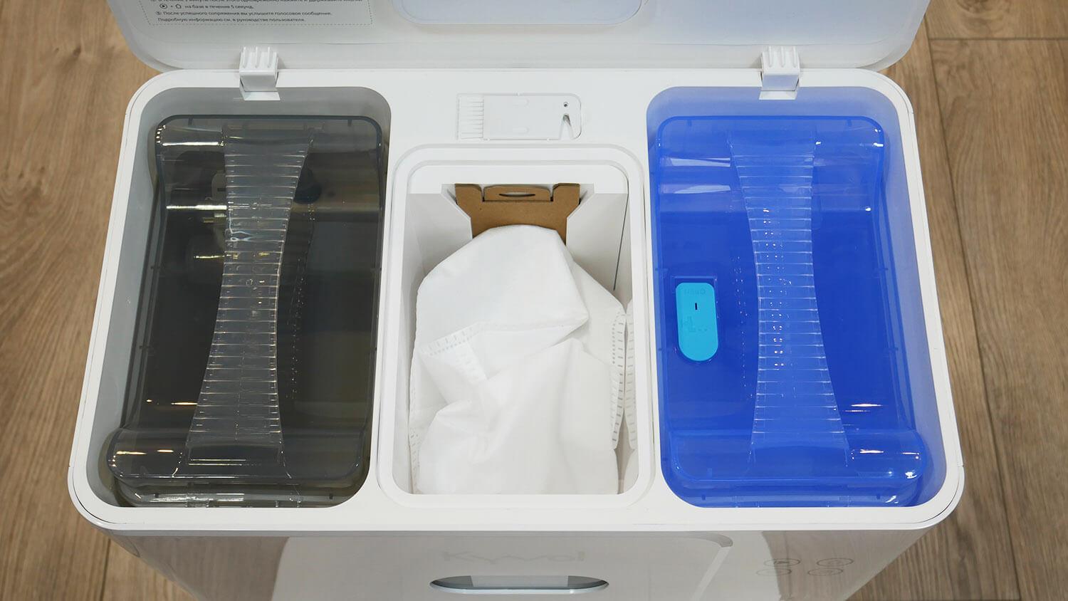 Po viršutiniu dangčiu yra talpyklos ir maišas sausoms atliekoms, kuriame patogiai laikomas roboto valymo įrankis. Švaraus ir nešvaraus vandens talpyklos talpina iki 4 litrų vandens. Padidinta talpa yra malonus pokytis. Maišelyje telpa iki 3 litrų sausų atliekų. Tai standartinio dydžio.