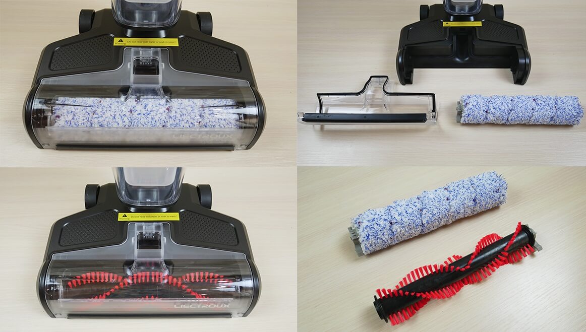 Pagrindinis grindų valymo šepetys sumontuotas po permatomu plastikiniu dangteliu su guminiu valytuvu. Jame yra minkštų šerelių volelis, kurio viduje paslėpti lankstesni raudoni šereliai. Tai įdomus dizainas; pamatysime, koks jis efektyvus, atlikdami bandymus. Keičiamas volelis turi lanksčius šerelius, tinkamus kilimams valyti.