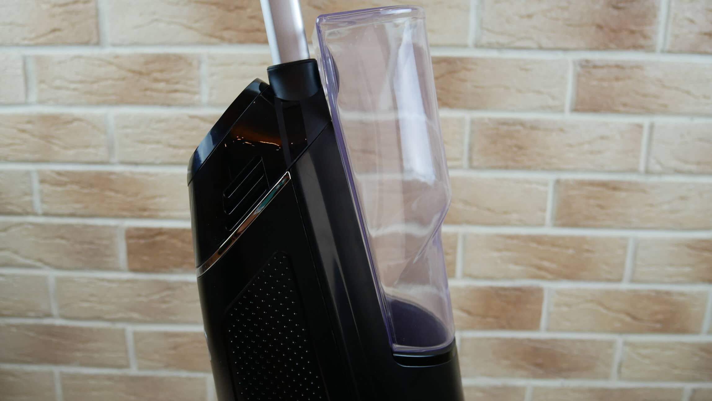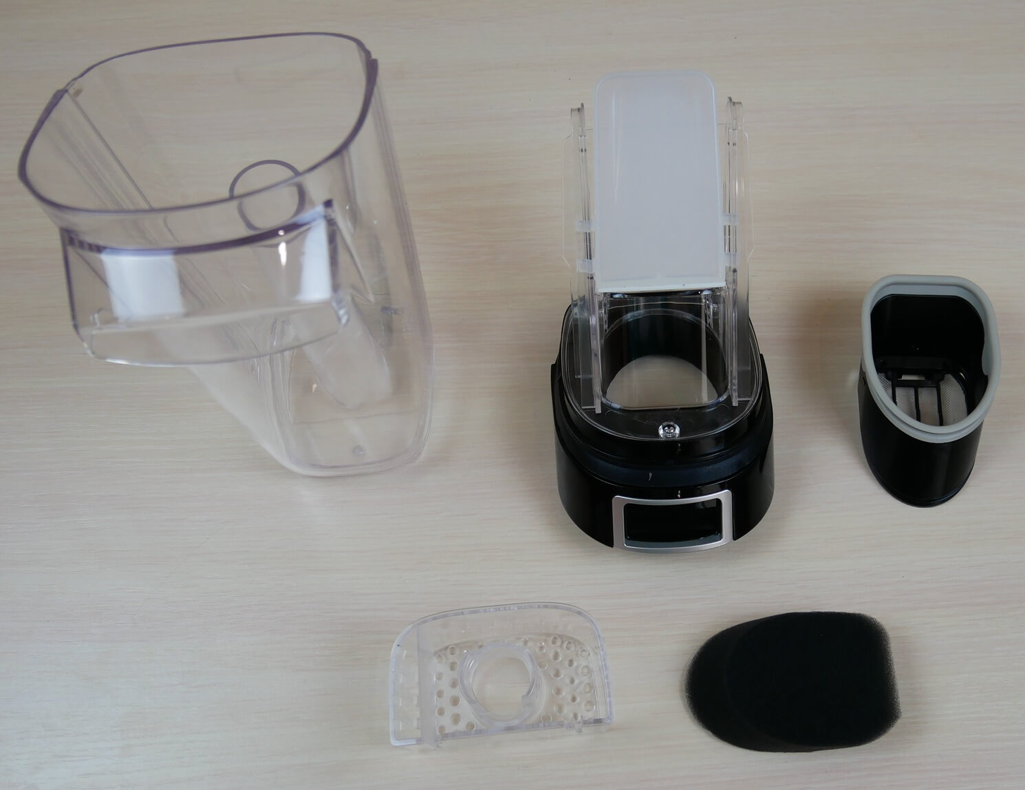 Nešvaraus vandens bakas yra šiek tiek sudėtingesnis. Viršuje sumontuota filtravimo sistema, naudojanti putplasčio ir tinklelio filtrą. Instrukcijose teigiama, kad kempinės formos filtras yra HEPA, tačiau taip nėra. Tai tiesiog putplasčio gabalėlis. Bako viršuje yra plūdė. Dugne yra papildomas filtras, kuris sulaiko didesnes šiukšles. Pats bakas turi patogią nešiojimo rankeną. Jame taip pat yra matomas žymėjimas, rodantis maksimalų nešvaraus vandens lygį, leidžiantis vizualiai įvertinti bako būklę.