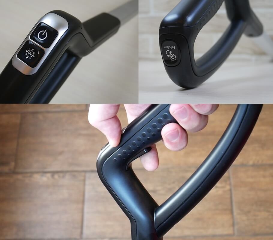 Kitas šlapio/sauso valymo dulkių siurblio komponentas yra rankena, kurioje yra valdymo mygtukai. Iš viso yra keturi mygtukai: maitinimo įjungimo/išjungimo jungiklis, UV lempos jungiklis, stotelės savaiminio valymo funkcija ir pirštais patogus mygtukas priverstiniam vandens srautui į volelį valdyti.