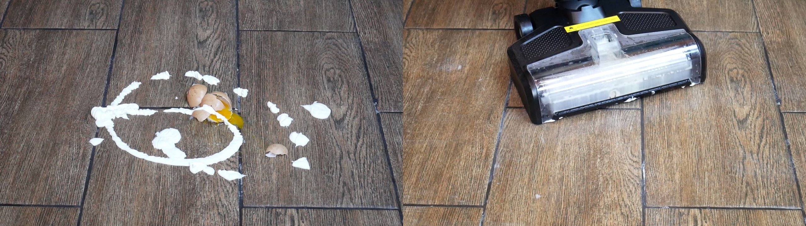 Na, pabandysiu pakartoti reklaminį testą – įmušsiu ant grindų žalią kiaušinį ir įpilsiu šiek tiek padažo. Įdomu, ar „Liectroux i5 Pro“ veiksmingai išvalys šviežias dėmes.