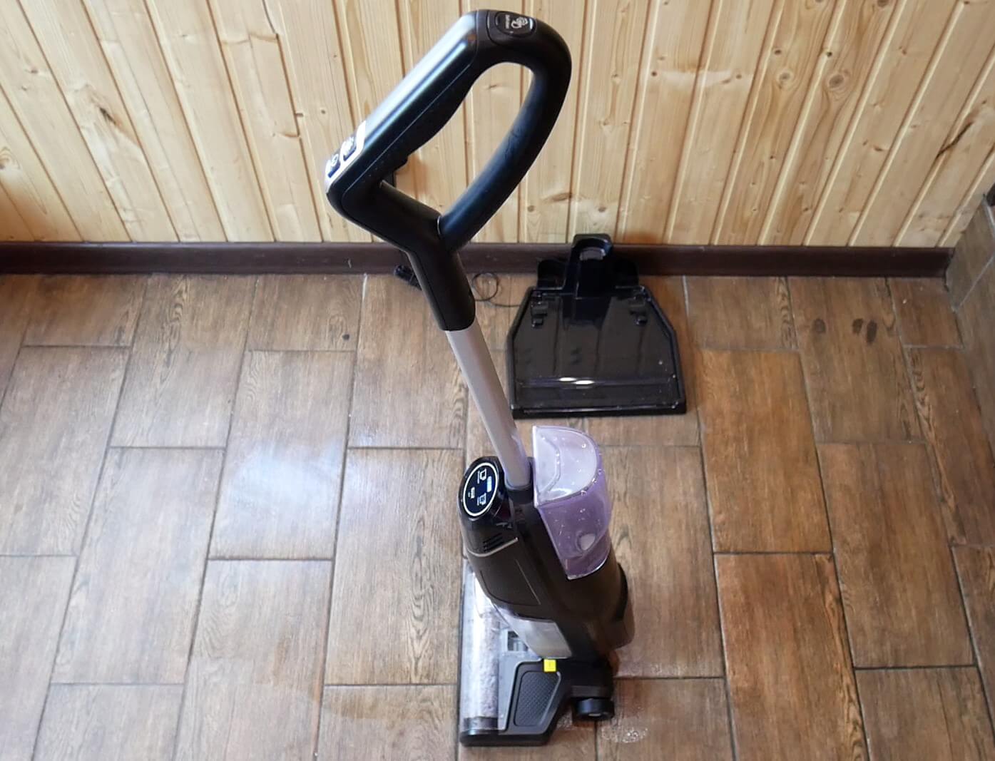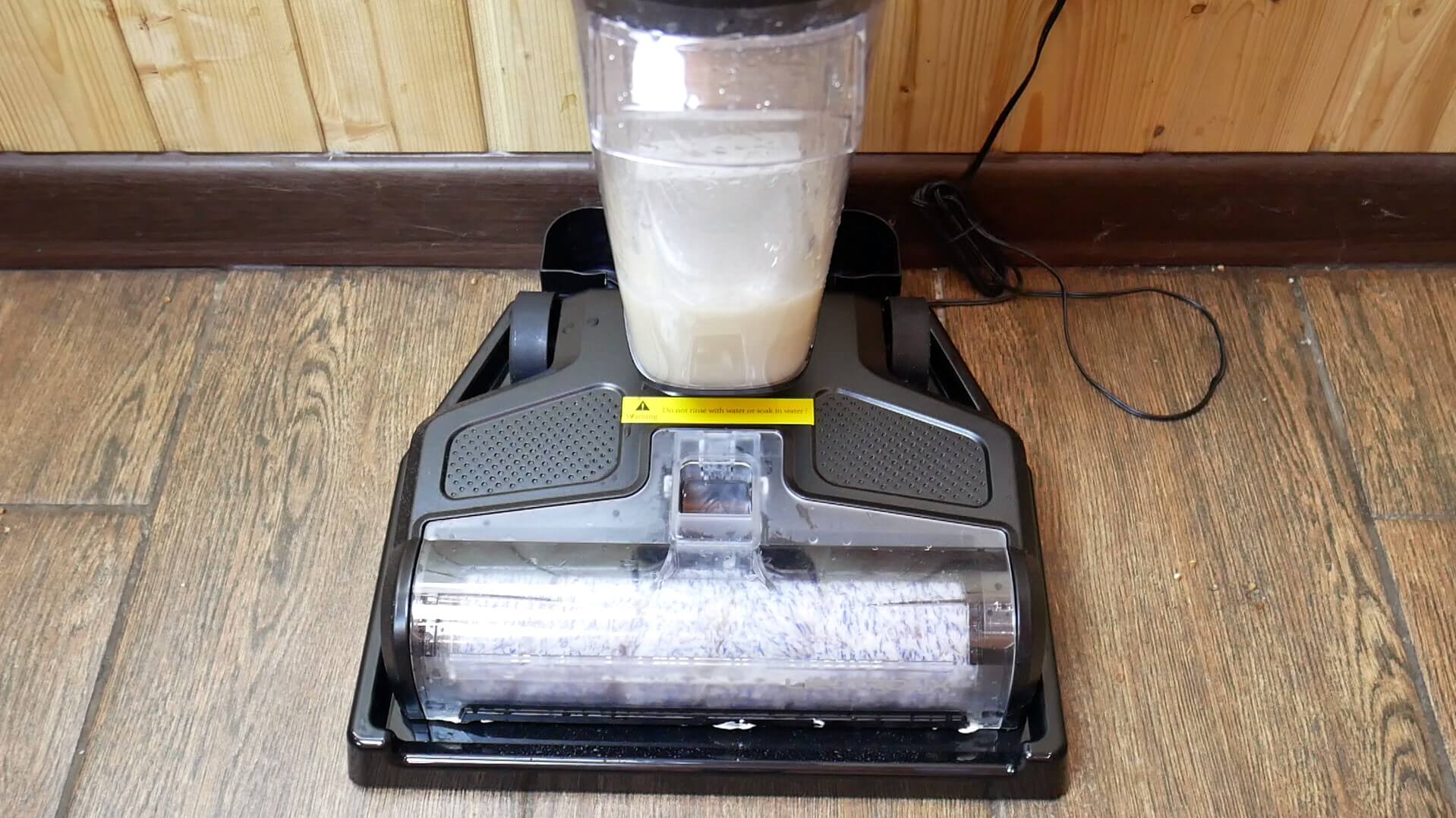 Pagrindinė dalis surinkta, bet matosi, kad šepetys užsikemša, o dulkių siurblys pradeda tepti mišinį ant grindų, todėl nerekomenduoju šio prietaiso naudoti šiam tikslui. Problema ta, kad vandens srovė nėra labai intensyvi, todėl nešvarumai nėra nuplaunami ir įstumiami į nešvaraus vandens talpyklą.