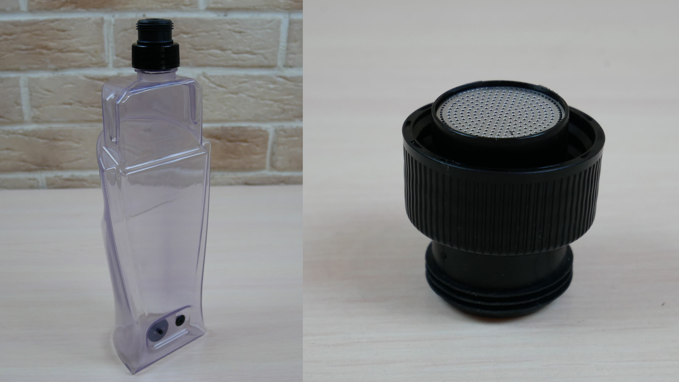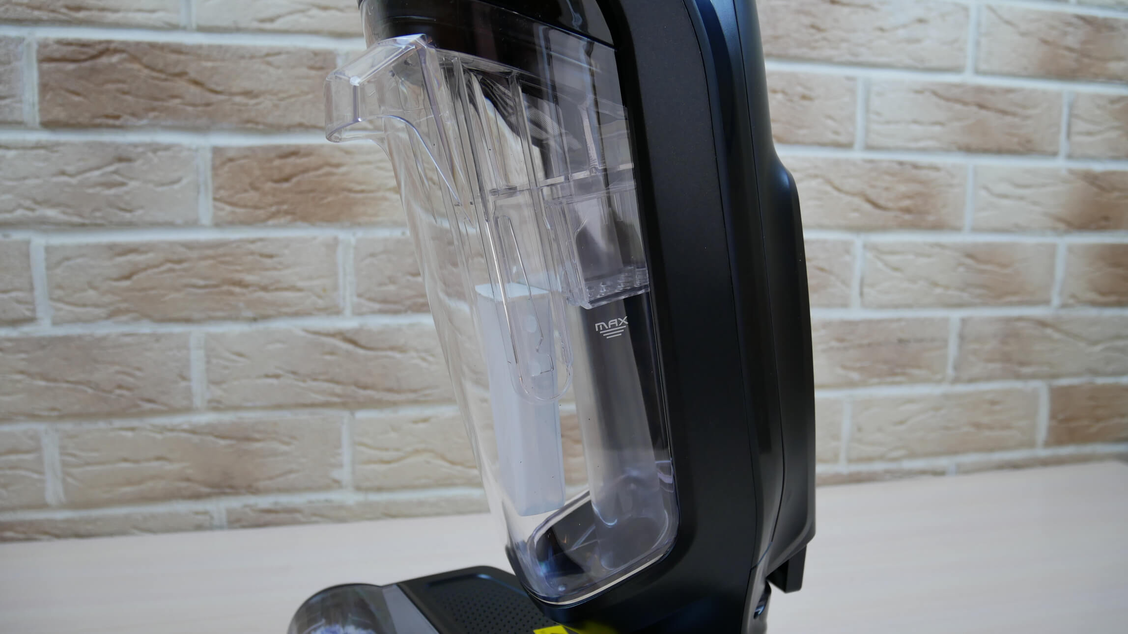 Pažvelkime į abu bakelius. Švaraus vandens bakelio talpa yra 750 ml. Viršuje pažymėta maksimalaus vandens lygio žyma ir linija, rodanti maksimalų ploviklio kiekį. Dangtelio viduje įrengta vandens filtravimo sistema, kad į plovimo sistemą nepatektų jokių dalelių.