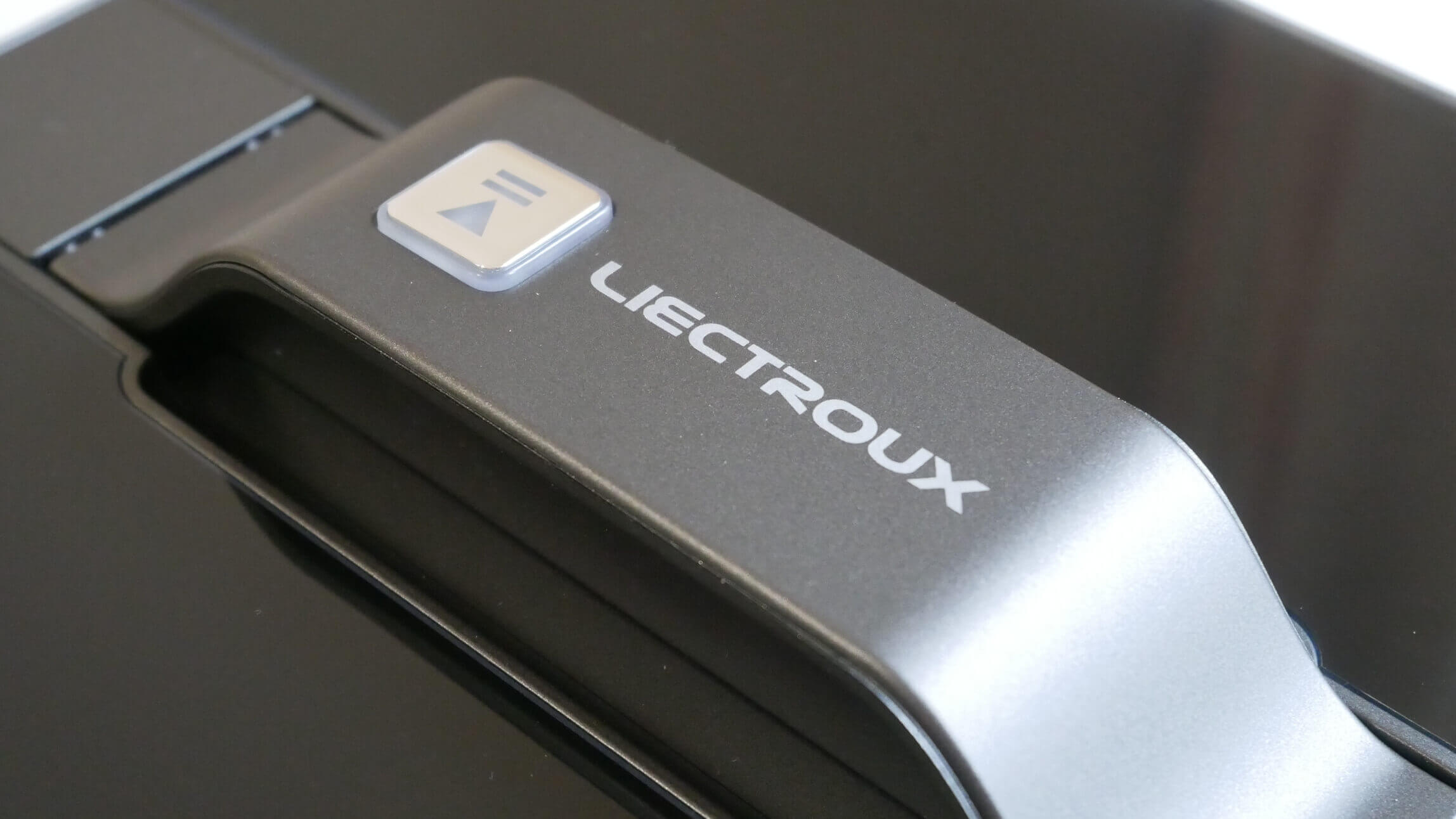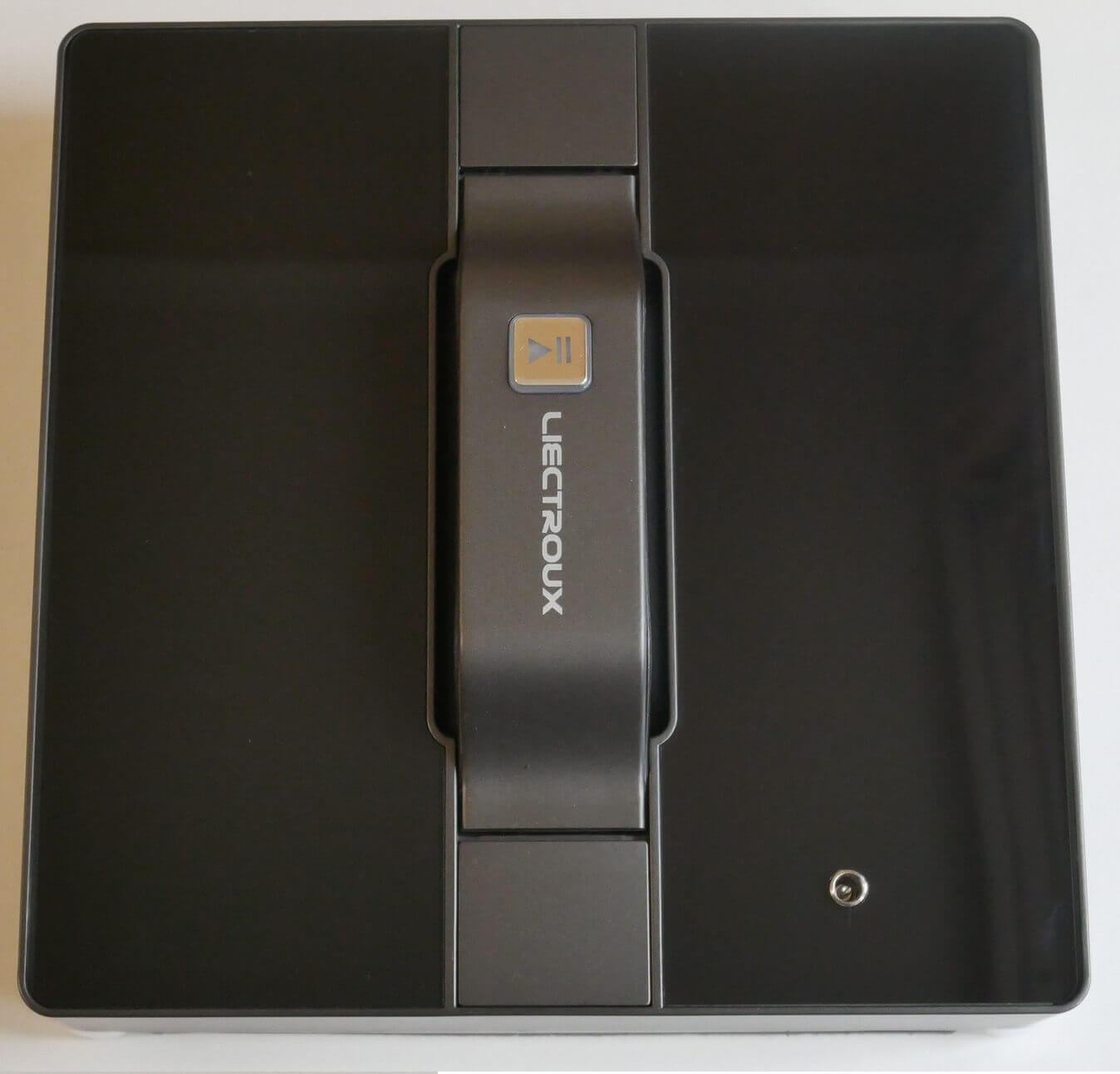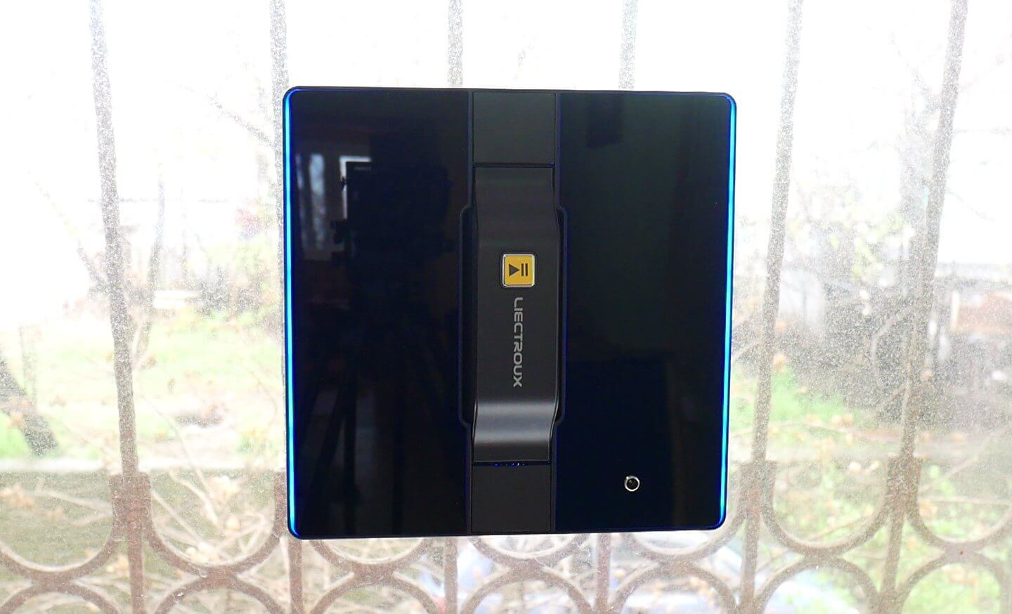 Dabar pažvelkime į patį langų valymo robotą. „Liectroux WS-1080“ yra kvadratinis. Jis juodas ir blizgaus paviršiaus. Viršuje yra rankena, skirta robotui pastatyti ant lango. Šioje rankenoje yra vienas paleidimo / pauzės mygtukas.