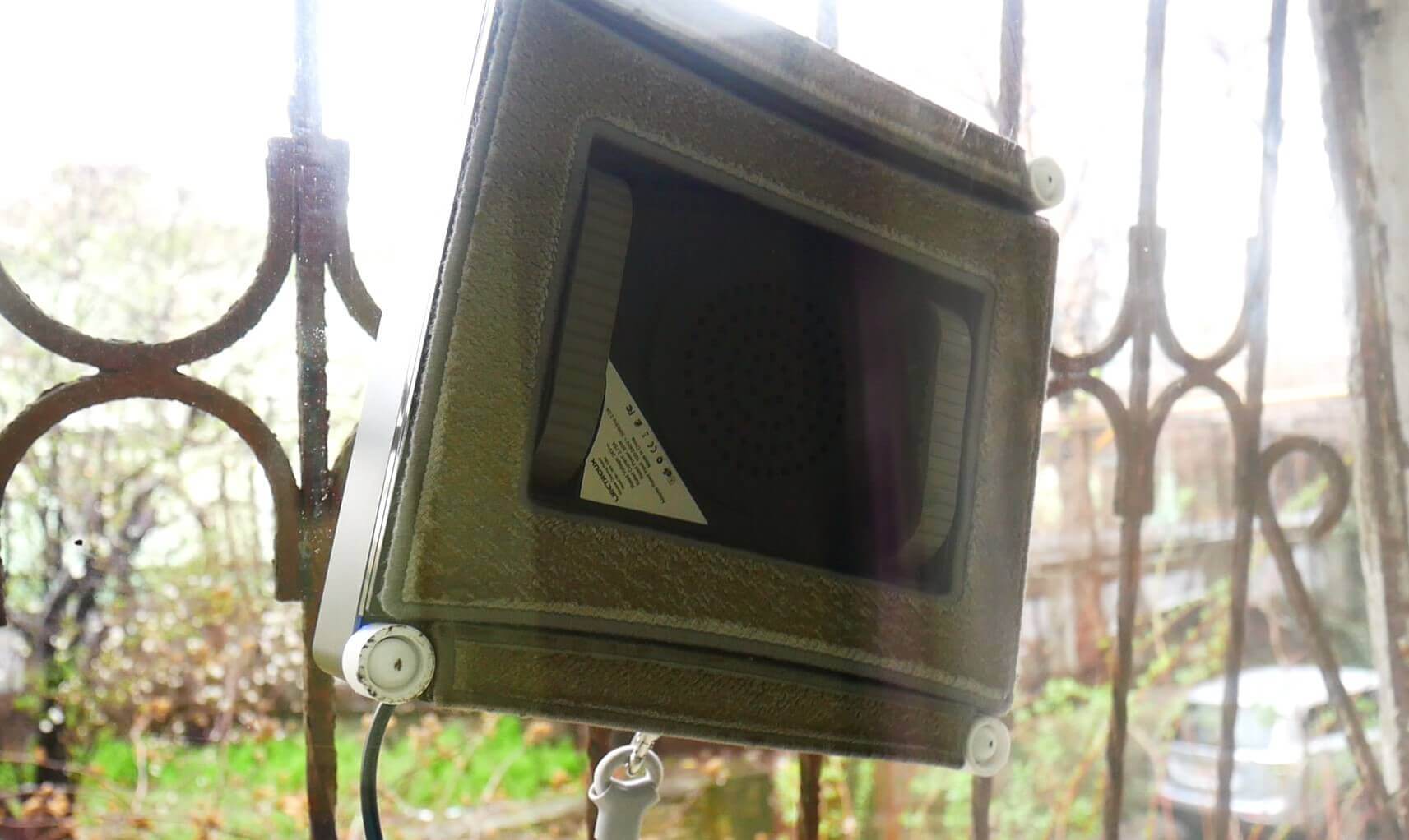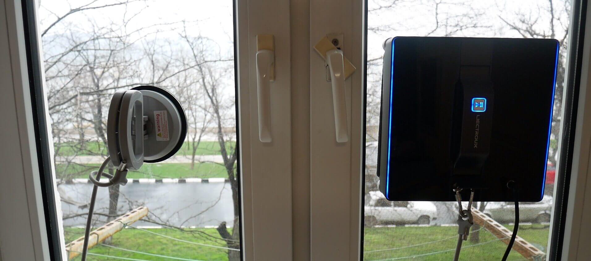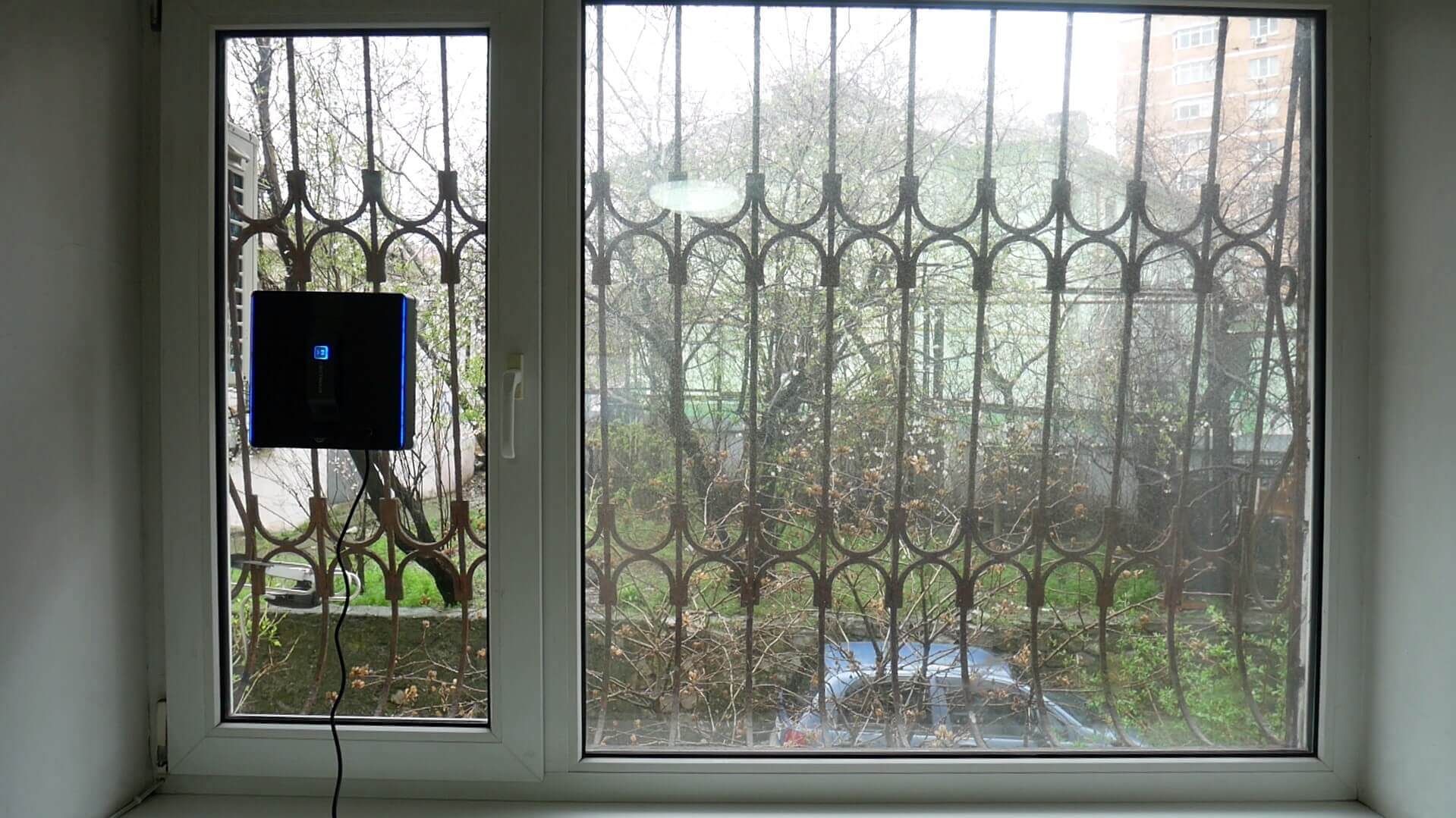Dabar išbandykime, kaip robotas po žiemos valo didelį langą iš išorės. Iš pradžių švarus langas būna gana nešvarus. Įrengiame „Liectroux WS-1080“, pritvirtiname apsauginį tinklą ir pradedame.